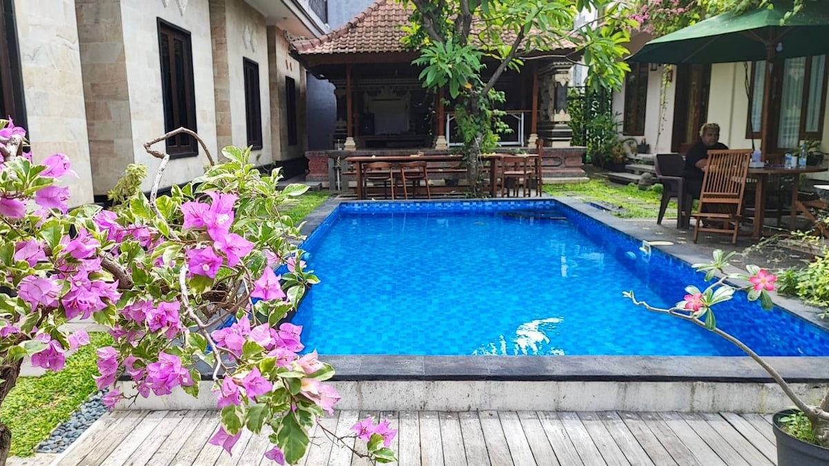 Բրայա լողավազանի մոտ գտնվող սենյակ ՝ հարմարավետ տուն լողավազանի մոտ Մեր Braya Poolside Room - ը հարմարավետ և հանգիստ տարածք է ընդհանուր լողավազանից և պարտեզից մի քանի քայլ հեռավորության վրա: Յուրաքանչյուր սենյակ ունի առանձին լոգասենյակ, օդորակիչ և Wi - Fi ։ Նախասրահի ընդհանուր խոհանոցը կարող եք օգտագործել թեթև կերակուր պատրաստելու կամ խմիչքներ պատրաստելու համար ։ Այն խաղաղ վայր է Սանուրում ՝ լողափին, սրճարաններին և խանութներին մոտ. կատարյալ է հանգստանալու և ձեր հանգիստը վայելելու համար ։