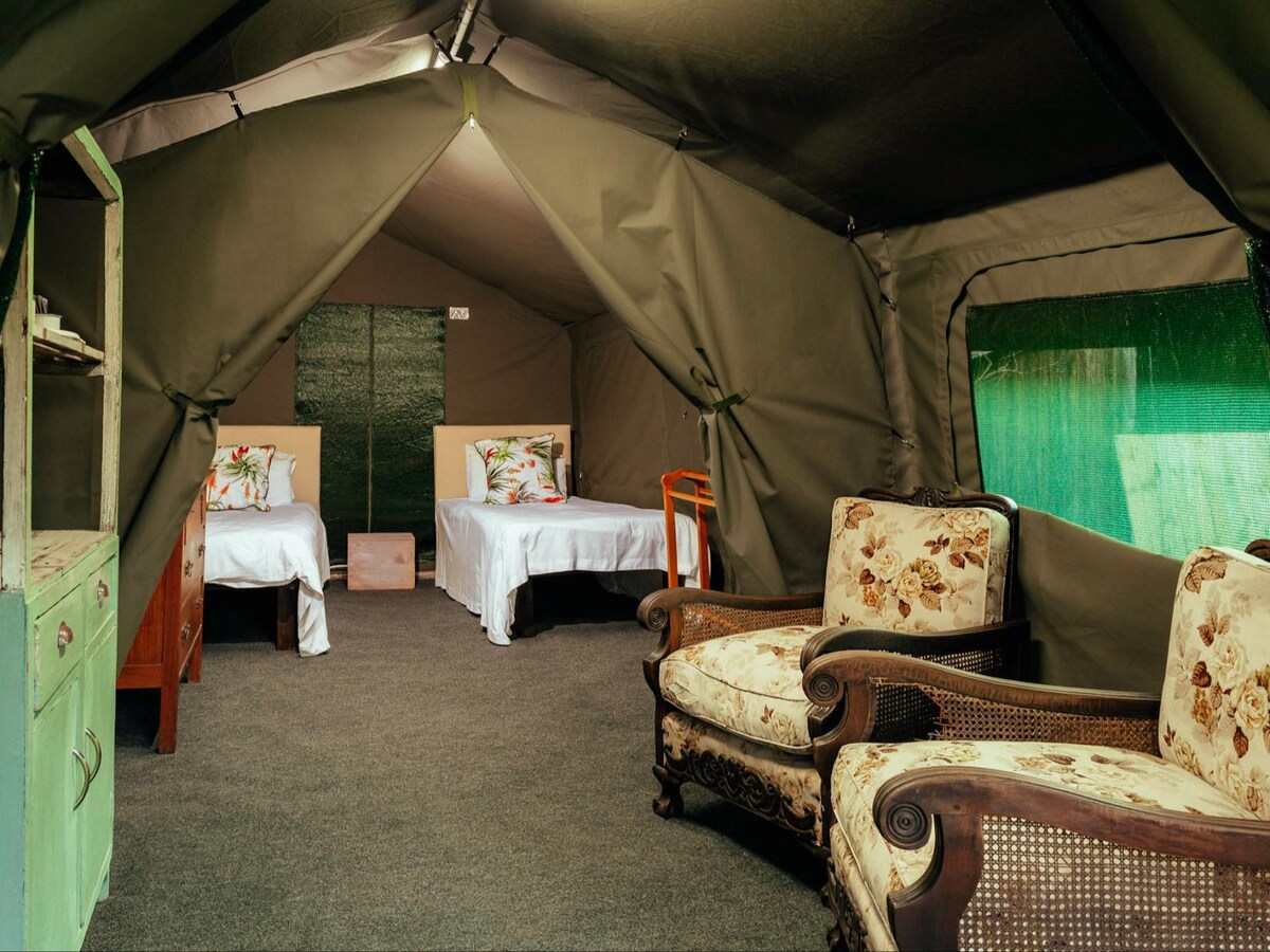 Safari tent with two x single beds (linen and towels provided); table and chairs and garden furniture; LED lights; coffee or tea facilities with plug point. Allocated kitchenette in communal area available. Close to clean ablution facilities.