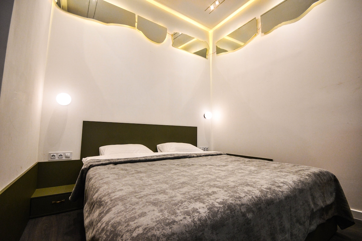 A cozy and modern studio on the 2th floor. The building is located in the center of Kyiv near the Olympic stadium, not far from the Gulliver shopping center and Khreshchatyk Street, 5-minute walk and you are near “the Olympic” metro station. The apartment has a queen size bed and a folding sofa, for 2 berths. The studio has a small kitchen, bathroom and toilet with everything you need, TV and WiFi. The studio is perfect for a comfortable staying of 4 guests or a family with a small child.