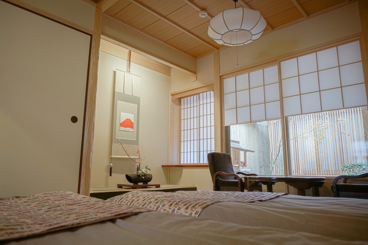 Կատարյալ վայրում տունն ունի ավանդական Կիոտոյի թաունհաուսի ողջ հմայքը ՝ տատամի գորգ, սահող փայտե դռներ, թղթե դռներ, այգու տեսարանով լոգասենյակ, բոլորը ՝ շքեղ ժամանակակից հարմարություններով և հարմարավետությամբ: Տունը 100 - ամյա թաունհաուս է, որը գտնվում է Չոմյո տաճարի ներսում, 5 րոպե քայլելով մետրոյի Sanjo sta - ից: Կամո գետը: Հարմար է Գիոն քաղաքին և Հեյյան սրբավայրին: Տունն ունի հանգիստ թաղամաս, մոտակայքում կան սուպերմարկետներ և ռեստորաններ: