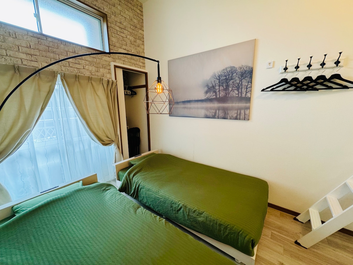 2Rooms&ロフト付きのお部屋で1階にあります。 専用の玄関で、トイレ、バスルーム、キッチン、部屋は全て貸切で専用です。 シングルベッドが2台、ロフトにダブルのマットレスが2つあります。 お部屋を広く使用したい時は、シングルベッドを重ねることが出来ます。 ◼️設備 TV、Wi-Fi、エアコン2台、冷蔵庫、電子レンジ、電気ポット、鍋、各種お皿(調味料はございません)洗濯機、洗濯洗剤、扇風機 ◼️アメニティー タオル、バスタオル、シャンプー、コンディショナー、ボディーソープ、ヘアードライヤー、歯ブラシ、歯磨き粉、スリッパ ◼️注意事項 ロフトの天井は低く、ハシゴの昇り降りが急ですので、高齢の方や小さなお子様には不向きです。 最大5人までご利用可能ですが、荷物を広げるスペースが狭いのでご了承下さい。 ◼️近くのコンビニ、スーパー コンビニ(セブンイレブン、ローソン、ファミリーマート)徒歩2分 ディスカウントストアMrMaxまで徒歩3分 スーパーマーケット(サニー、マックスバリュー)まで徒歩3分 同じ建物にも部屋がありますので、人数が多い場合はご連絡下さい。