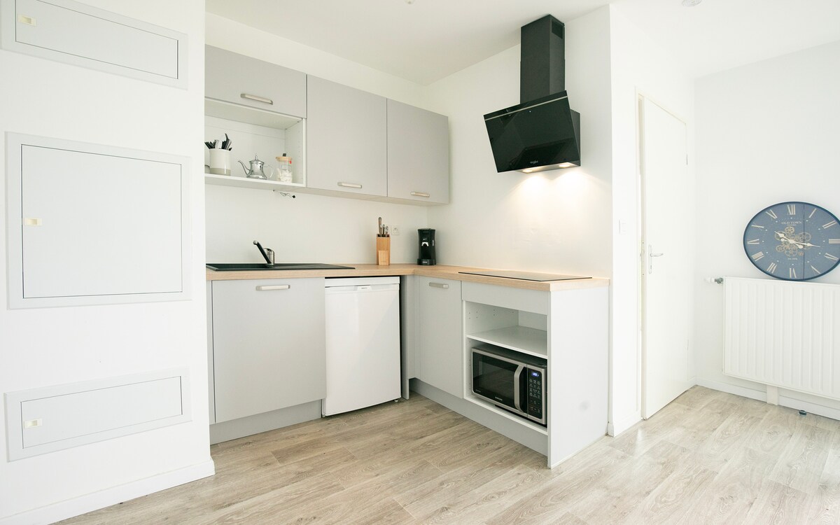 Ravis de vous accueillir dans ce nouvel appartement très ensoleillé avec une entrée indépendante, 2 chambres, dont un lit de 160 et 2 lits de 90, lits faits à votre arrivée, une salle d'eau, serviettes fournies, toilettes séparés, une grande pièce de vie avec cuisine équipée comprenant lave vaisselle, hotte, plaque induction, frigidaire, micro onde, télévision et wifi, lave linge dans l entrée, 2 places de parking Commerces et restaurants à 900m boulangerie, Grand Frais , Burger King Action