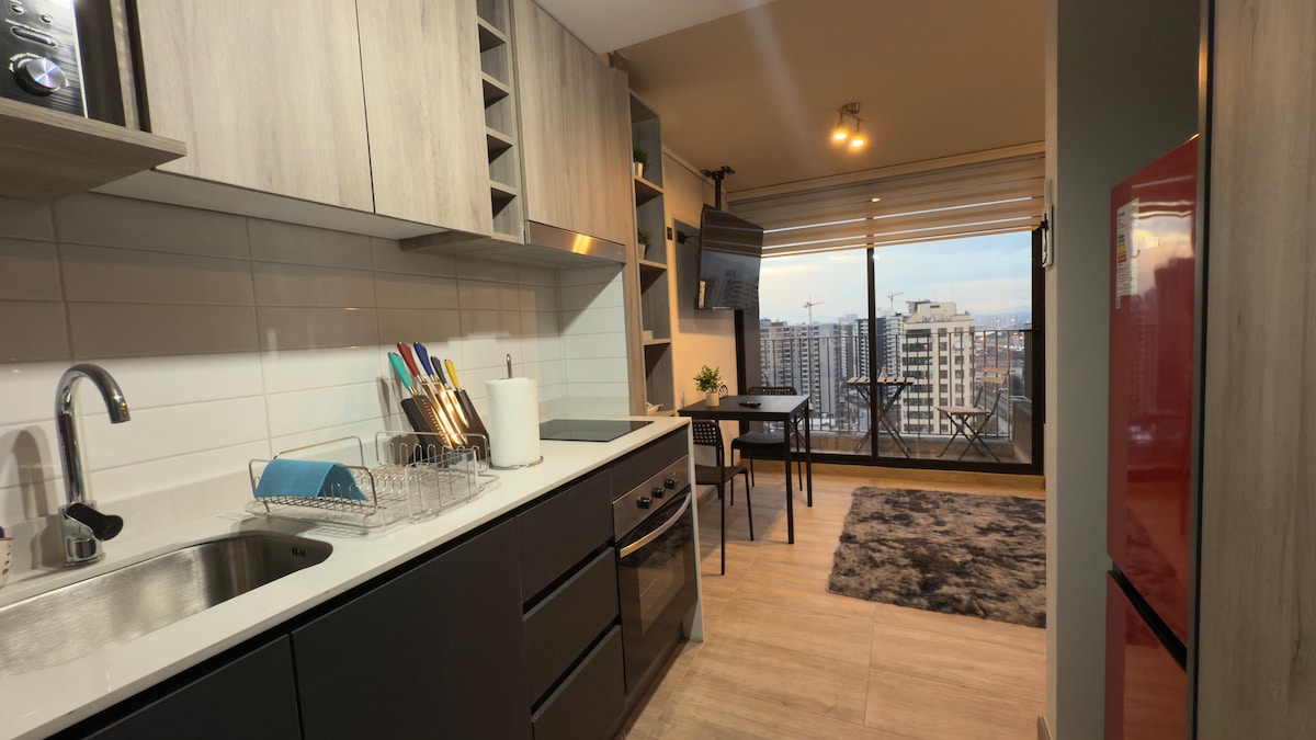 Վայելեք ժամանակակից, լուսավոր և հարմարավետ տարածք՝ պատշգամբով և լեռնաշղթայի բաց տեսարանով։ Բնակարանը հարմարավետ տարածքներ, ջերմ դիզայն և հանգստի կամ խաղաղ աշխատանքի համար անհրաժեշտ ամեն ինչ է առաջարկում։ Գտնվում է մետրոյից կես թաղամաս հեռավորության վրա (4-րդ և 5-րդ գծեր), այն թույլ է տալիս ուղիղ կապ հաստատել պատմական կենտրոնի (Plaza de Armas), Costanera Center-ի և Viña Concha y Toro-ի հետ։ Մալպլազա Վեսպուչիոյից (H&M, Zara, Falabella և այլն), Դավիլա կլինիկայից, Red Salud-ից, սուպերմարկետներից և բազմաթիվ սննդի տարբերակներից քայլելու հեռավորության վրա։