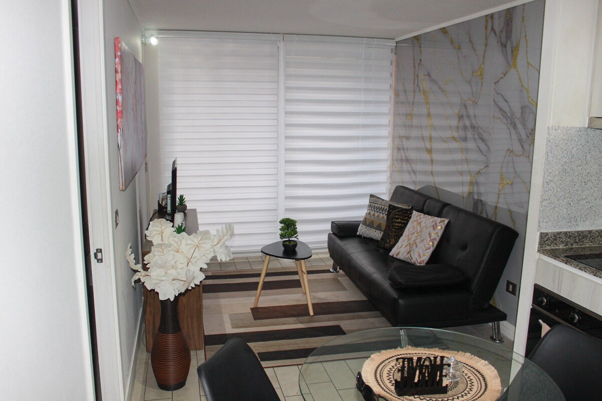 Ժամանակակից և հարմարավետ բնակարան՝ օդորակիչով, Սանտյագոյի սրտում։ Մետրոյից և պատմական կենտրոնից մի քանի քայլ հեռու, թանգարաններով, շուկաներով և ռեստորաններով շրջապատված։ 190–22 սմ մահճակալ, կահավորված խոհանոց, պատշգամբ և արագ Wi-Fi՝ իդեալական կարճ կամ երկար այցերի համար։ Ապահով շենք ՝ շուրջօրյա դռնապանով ։ Անհատական ուշադրություն, ժամանման ճկուն ժամկետ և տեղական խորհուրդներ, որպեսզի կարողանաք վայելել քաղաքը ինչպես տեղացի, հարմարավետ և հանգիստ։
