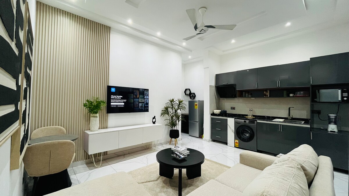 Experience an elegant ambiance with clean contemporary finishes.This stylish 1-bedroom apartment is designed for guests who value comfort. Perfect for business, leisure, or extended stays. Situated in a quiet neighborhood just 18 minutes from Kotoka International Airport, 15 minutes from East Legon's dining and nightlife, 10 minutes from Atlantic Mall, and about 30 minutes from the scenic Aburi Botanical Gardens. You get easy access to both the city’s excitement and nature’s calm.