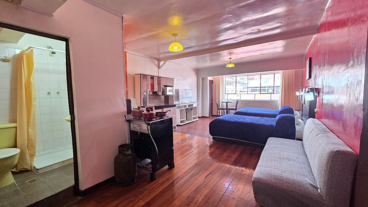 una habitación muy céntrica, cerca de restaurantes, pubs, cafeterías, áreas turísticos como la calle de la brujas y/o paraguitas, tambien la plaza principal de la ciudad esta a 10 minutos palacio de gobierno entre otros. la habitación es bastante cómoda y bien equipada con lo necesario y de fácil acceso.