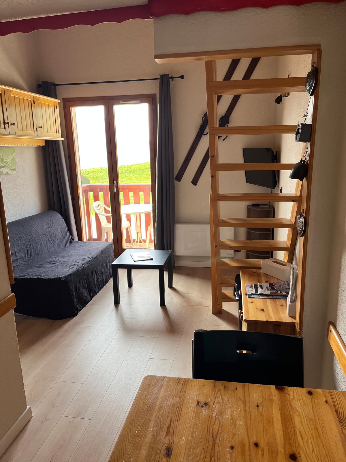 Հարմարավետ և ջերմ ստուդիա 4 հոգու համար ՝ լանջերի ստորոտում ։ Առաջարկում ենք լեռնային տեսարաններ ։ 22մ² մակերեսով ստուդիա, այդ թվում ՝ փակ խոհանոց, լոգասենյակ ՝ առանձին WC - ով ։ Քնելու հարմարություններ. 1 երկտեղանի լոֆթ մահճակալ և երկտեղանի թախտ հիմնական սենյակում ՝ հարթ էկրանով հեռուստացույցով ։ Պատշգամբն ավարտում է կացարանը ։ Ստուդիան իդեալական է, գտնվում է լանջերի և լեռնադահուկային վերելակների ստորոտում և բոլոր հարմարություններին մոտ, և օգտվում է փակ լեռնադահուկային սենյակից ։