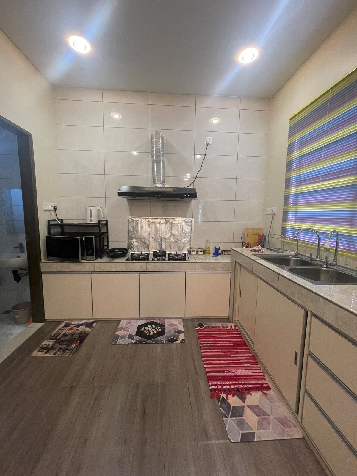 This home has 2 levels however upper level is lock for private use. The ground level have 2 bedrooms with a queen bed and sofa bed each room available up to 6 or 7 persons however another king floor mattress up to 2 or 3 persons will be provided in common space. You can enjoy everything in the ground level and no one will interfere during your stay. It's suitable for big group of people, family and friends. Mini grocery shop just 3 minutes by walk. City center takes about 10 minutes by car.