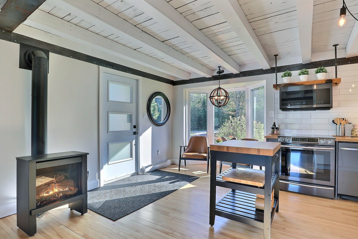 Monumental open concept, in the heart of nature. Access to trails directly behind the house. Wood stove, large modern bathroom, one bedroom + sofa bed. Another sofa bed in the living room. Ideal chalet for a couple with children or two couples. Wild birds, turkey, and deer lovers welcome! Wifi and EV charger included. Dogs Welcome! CITQ : #308038