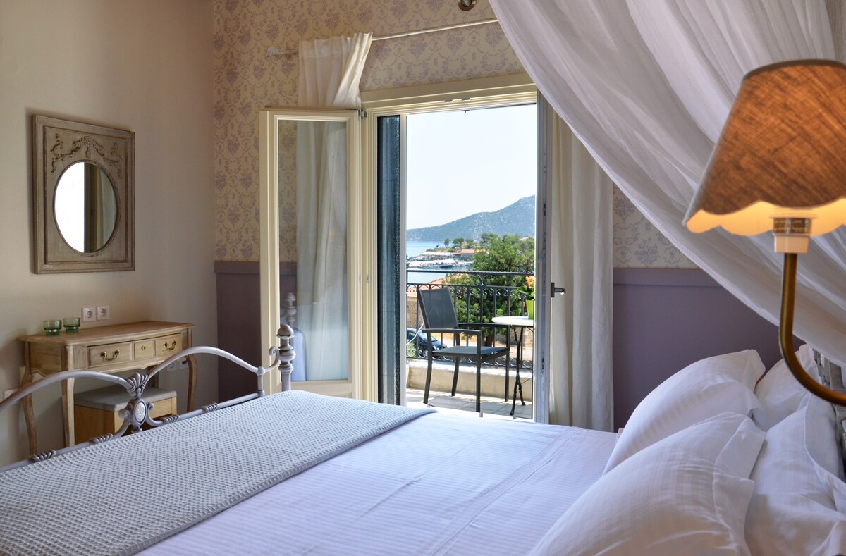 he Sea View Balcony Apartment (2 bedrooms) accommodates up to 4 guests with 2 bedrooms – one with a double bed and the other with two single beds. It combines comfort, accessibility, and stunning views of the clear blue sea with Hydra in the background. It is equipped with air conditioning, a bathroom, a fully equipped kitchen, Wi-Fi, a smart TV, and a sofa. The balcony also features a dining table and chairs for relaxation.