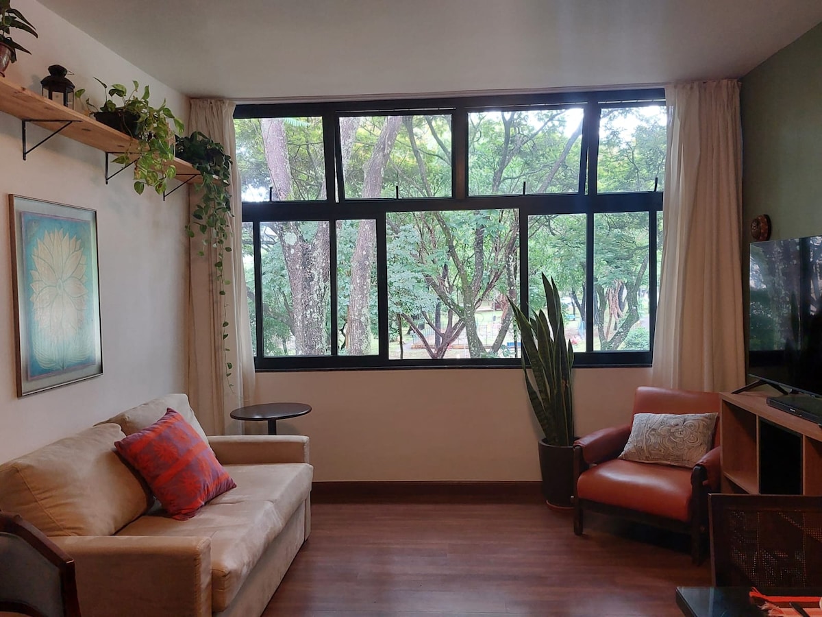 Charming, equipped and clean space in an excellent square in Brasilia, designed by architects to offer a complete stay experience in the capital. With an open view and surrounded by vegetation, it has a full kitchen and quality bedding and bath. Quiet neighborhood, but super well equipped, with restaurants and shops, Pão de Açúcar supermarket and drug stores and even a gym with a daily or weekly pass. BUILDING WITHOUT ELEVATOR. design by @ladrilharia_arq photos @juliatotoli.foto