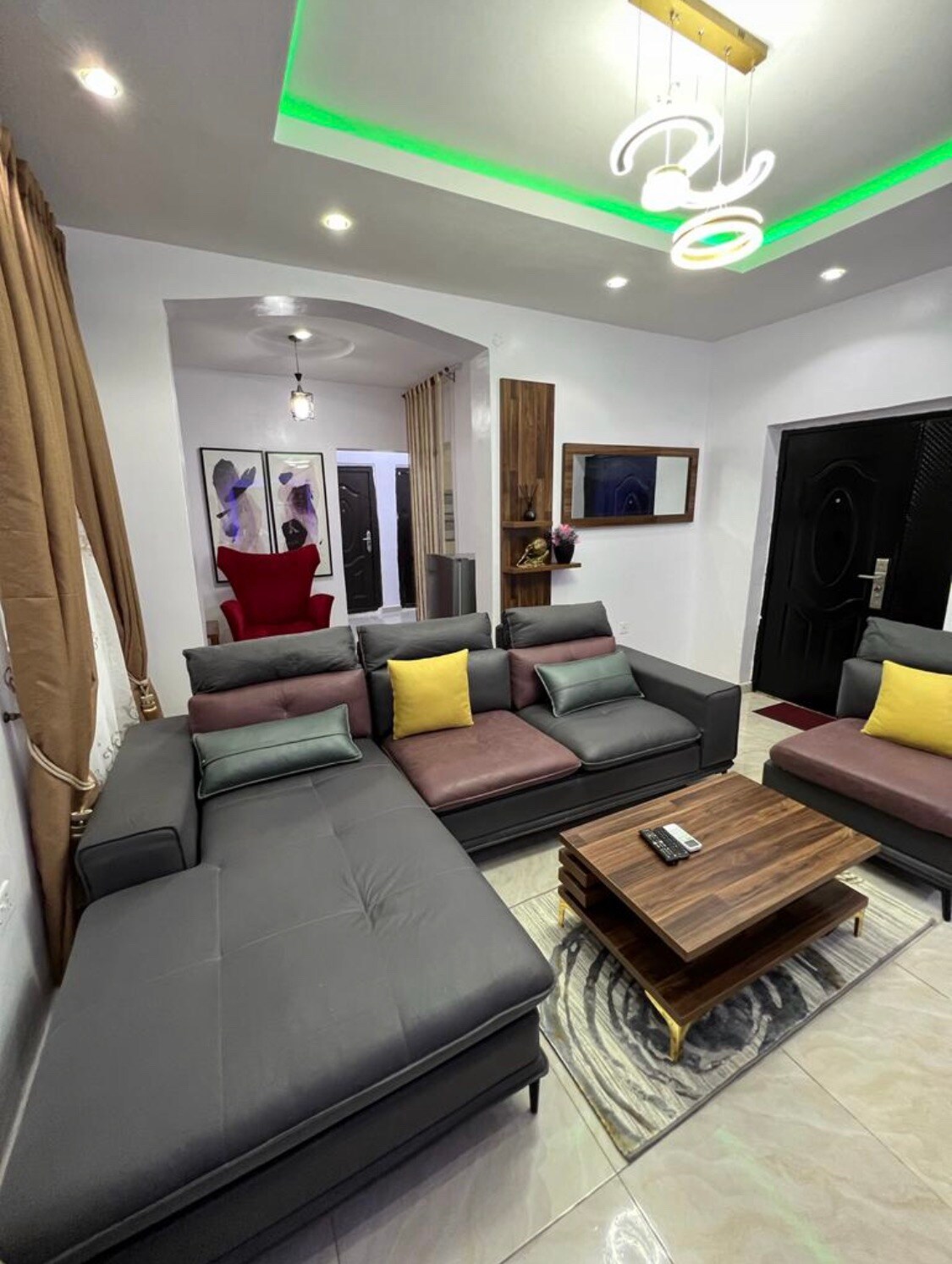 Features: Ac, Refrigerator, 24hrs power supply with inverter backup plan, microwave, kitchen with utensils, Heat Extrator, Water heater, Gas cooker, chandelier, Gated compound with Car park, PS4 video game, Dstv, Security personnel. kick back and enjoy our peaceful and stylish apartment