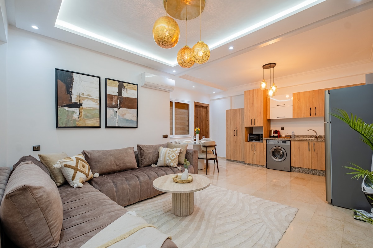 Séjournez en plein cœur de Marrakech dans notre appartement 2 chambres et 2 salles de bain. Profitez d'une literie Simmons haut de gamme, WiFi haut débit (fibre optique) et d'une décoration moderne avec une touche ethnique. Cuisine entièrement équipée, baignoire élégante, et douche italienne. À quelques pas de la place Jemaa el-Fna, du Plazza, et du Carré Eden. NB : Les couples marocains non mariés ne sont pas autorisés.