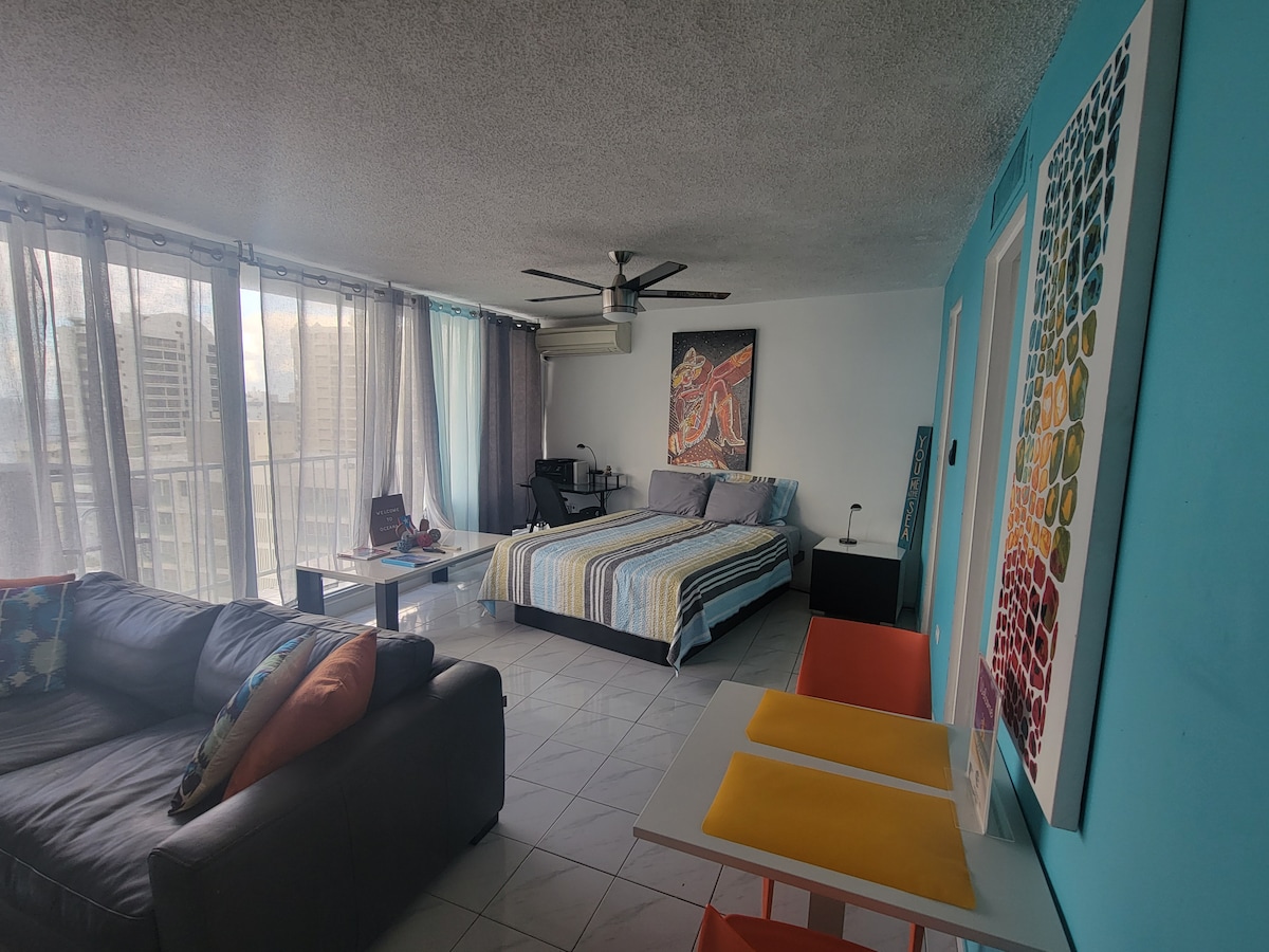 Right in the center of San Juan, this apartment has spectacular views of the Ocean and the City. Walking distance from the beach, Old San Juan, and Condado area. This apartment has everything you need to enjoy your stay. This unit includes a fully stocked kitchen, washer/dryer, office space, and parking.Master Bedroom has a Queen sized over looking the amazing view of the ocean and the city, and the Sofa bed is a full sized for 2 more