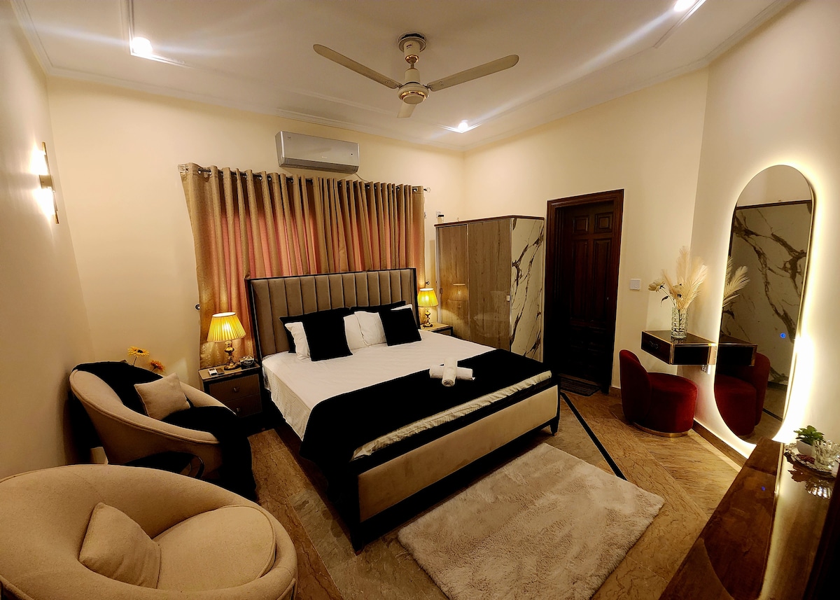 Մեր 1 BHK Orbit Penthouse-ը DHA Phase 5-ում այն վայրն է, որտեղ քաղաքային շիկը հանդիպում է երկնային զովությանը։ Պատկերացրեք՝ լուսնող պատ՝ ուշ գիշերային սելֆիների համար, և դոլարներով լի արվեստի գործ, որը ճչում է «հիմնական հերոսի էներգիա» Արթնացեք և վայելեք զբոսայգու տեսարանները ձեր մասնավոր պատշգամբի ճոճանակից, դիտեք ձեր սիրած ֆիլմերը 50 դյույմանոց 4K Smart TV-ով կամ պատրաստեք գեղագիտական ուտեստներ լիովին կահավորված դիզայներական խոհանոցում։ Ինտերիերները՞։ Աբստրակտ, նորաձև և լուսանկարելու համար։ Բացի այդ, դուք գտնվում եք Լահորի ամենահայտնի ռեստորանների կողքին։