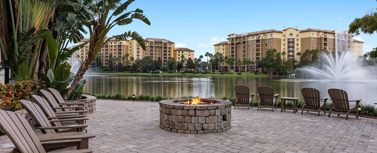 Orlando Resort Next to Disney Magic | Lazy River + Fire Pit Start your morning with coffee on your private balcony, just minutes from Walt Disney World. After a fun-filled day, float along the lazy river, soak in one of the outdoor hot tubs, or unwind by the fire pit under the stars.