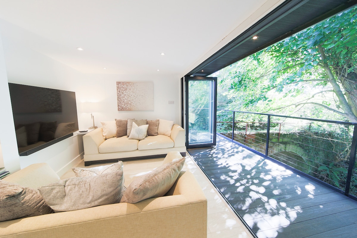 The Hide Lodge is a stylish space, designed with relaxing and retreating in mind. It is cosy and warm with underfloor heating. The open plan lounge and living area has full width bi-fold doors, which allows the space to be fully opened up to feel like part of the woodland beyond. The main bedroom boasts sliding french doors, also overlooking the woodland and stream, with a bath placed to enjoy this view. There is a private terrace and patio area to enjoy al-fresco dining or star-gazing.