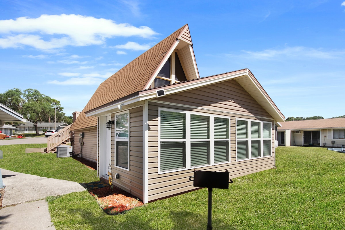 Hook’s Cabin is nestled within the peaceful gated community of Vacation Village it is a beautifully renovated A-Frame home and your perfect place to stay & play! You will enjoy private Lake Louisa access, Heated Olympic-sized community Pool, Pickleball / Basketball courts, play grounds, & FREE parking, Fast WiFi, flat screen smart Tv's w/ cable, full kitchen, & in home laundry. All less than 25 mins from Disney & other Orlando theme parks, and 5 miles from the National Training Center.