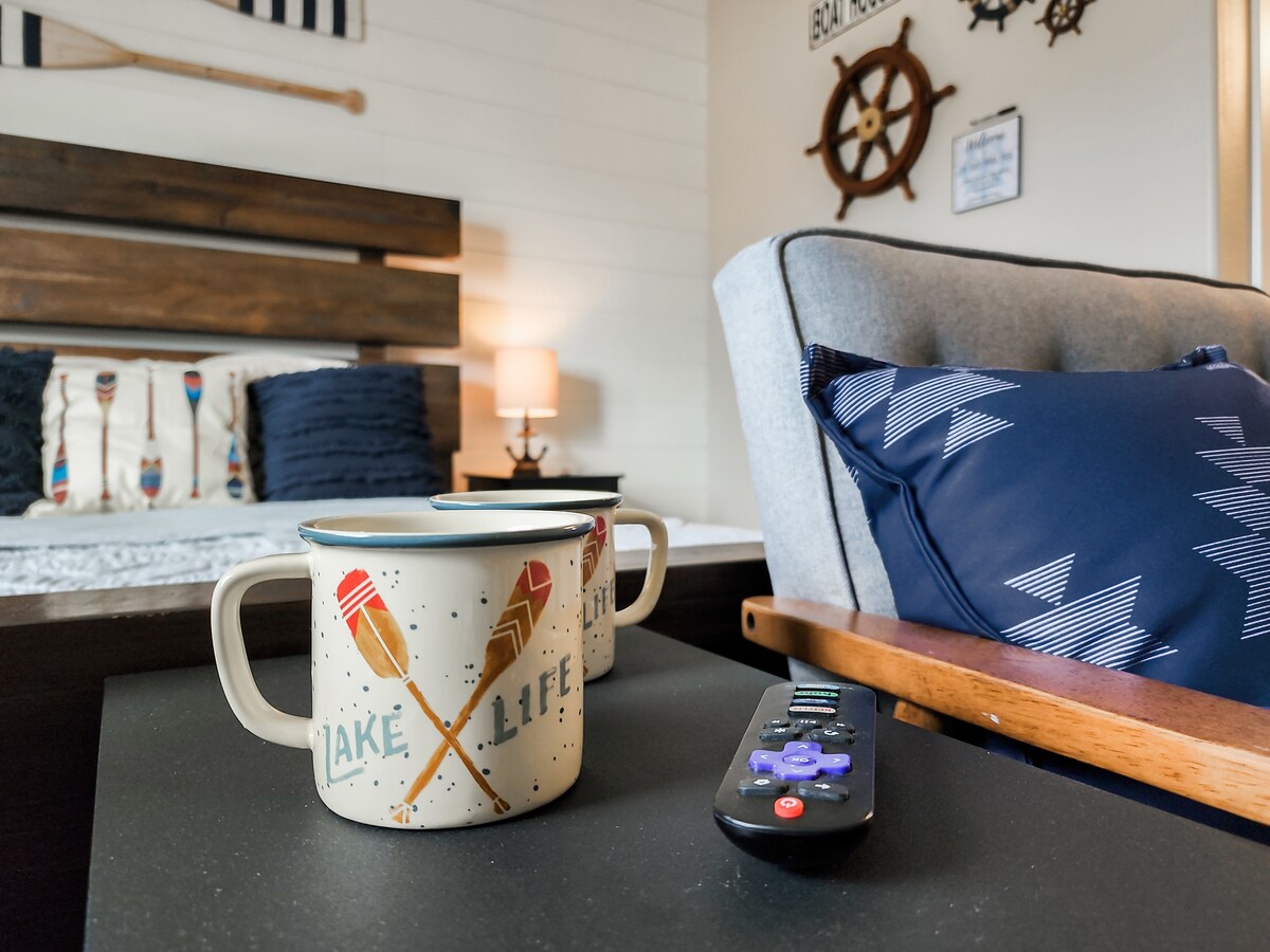 The modern conveniences of The Little House sharply contrast the old-fashioned construction. Original rough sawn ceiling joist are exposed, with the builder's layout marks clearly visible on the ceiling highlight the main living area where you can relax on the sofa. Along with the flat-screen TV, scorching fast 1 gigabit per second fiber internet (1000 Mbps) is available for streaming.
