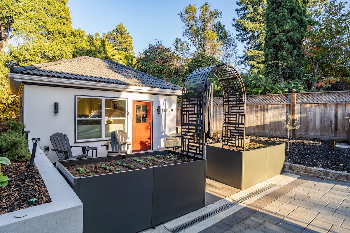 Linger over a coffee in the zen, vine-covered courtyard at this secluded cottage nestled in the back of a period property in Berkeley. Crisp white sheets, craftsman furniture, and painted wooden cladding make for a sophisticated yet rustic haven. The main room is cozy with a big skylight, comfortable queen bed, swivel chair, and desk and chair. There is a small kitchenette. Outside is a stone patio, a swinging bench that overlooks a koi pond, and a small outdoor table and chairs. ZCSTR2021-0842