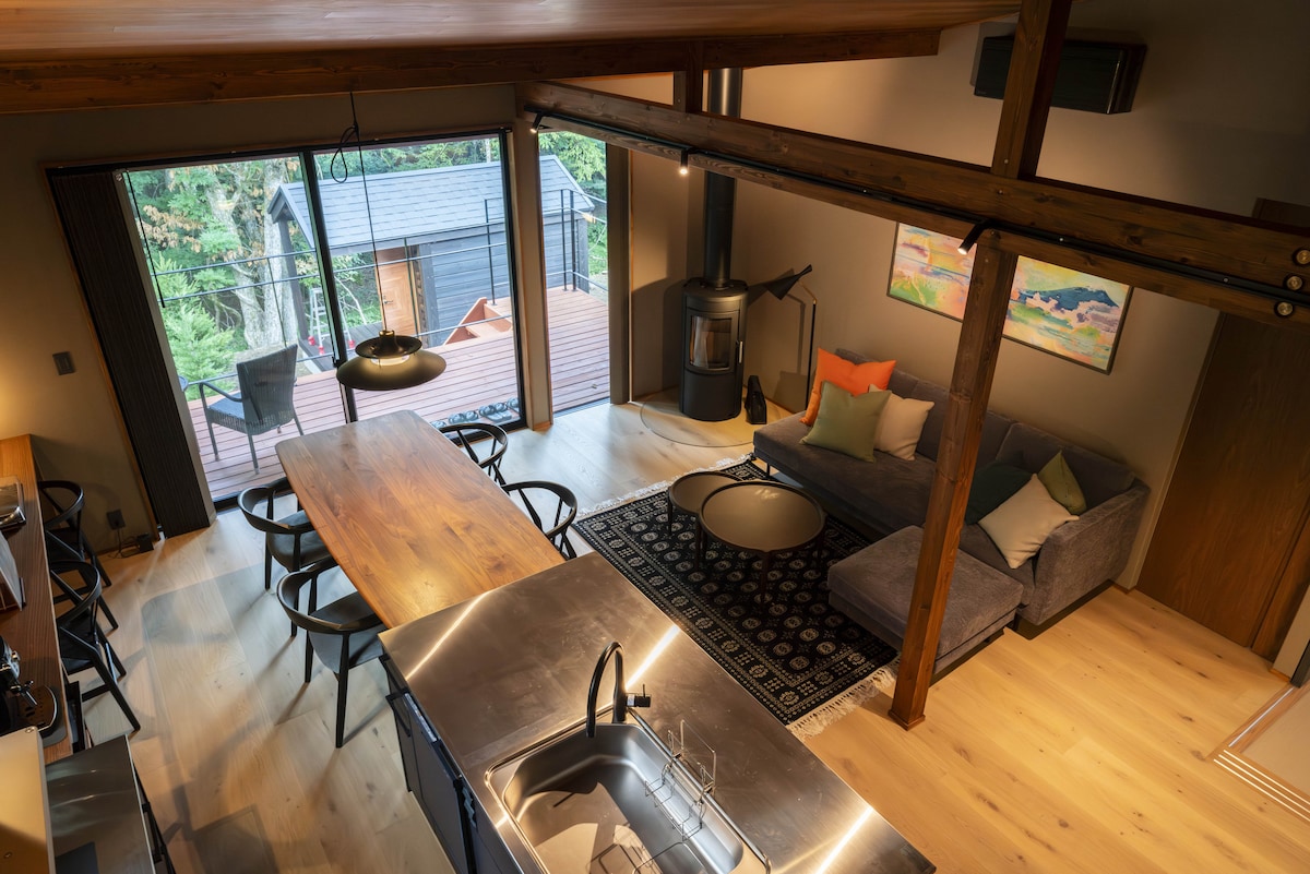 2024年7月にデザイナーによるリフォームをした、山中湖から徒歩11分の別荘地にある 「プライベートリゾート 富士」 という一日一組限定の宿です。 延床面積115㎡、3LDK のログハウスを基調とした和モダンデザイン一軒家で、 2階にあがると、リビングの窓から大きな富士山を望むことができ、富士山をバックに大きなバルコニーでBBQをしたり、木々に囲まれたバレルサウナを満喫した後には、そのまま外の休憩スペースで森林浴をしたりと、していただけます。庭には、大きな焚き火台があり、火を囲んで語らうこともできます。また、庭には高めの柵を設置しているため、愛犬を連れてきても逃げてしまう心配はございません。 部屋には90インチの大型スクリーンがあり、Prime Video、Youtube などが楽しめます。夜には、条件が良ければ満天の星空も見ることができます。