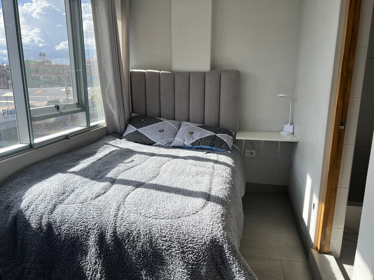 Moderno y tranquilo departamento ubicado en la Zona más Segura del centro de la ciudad de Juliaca, frente a Real Plaza,con todas las comodidades para hacer de su estadía una experiencia cómoda y cálida, en un departamento de 1 habitación con cama Queen y colchón ergonómico de espuma viscoelástica para un mejor descanso, también cuenta con un smart tv de 65" con internet de alta velocidad, 1 sala con vista para apreciar atardeceres, cocina equipada, baño y ducha con agua caliente las 24hrs.