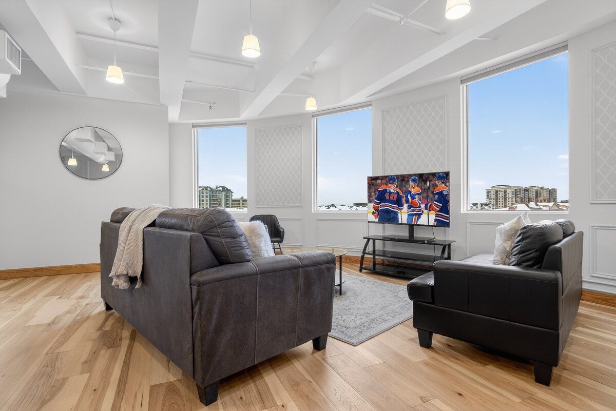 Այս յուրահատուկ լոֆթը գտնվում է Էդմոնտոնի կենտրոնում ՝ Ռոջերս Փլեյսին, Գրանտ Մակեվան, UofA - ին, River Valley - ին, ֆերմերների շուկային, LRT - ին և ռեստորաններին մոտ: Լոֆթն ունի բաց կոնցեպտ ՝ բարձր առաստաղներով, կոր ճարտարապետական դիզայնով, որը կատարյալ տեսարան է բացում դեպի քաղաքի կենտրոն ։ Անհատականացված խոհանոց, սաունա, ՄԱՐԶԱՍՐԱՀ, A/C, սպա, օրինակ ՝ ցնցուղարանով և թրջոցով զբոսանք ։ Հետագա տարրերը ներառում են երկտեղանի և երկտեղանի մահճակալ, առանձնաբաժնի լվացքատուն, Մեծ Բրիտանիայի կայանատեղի (փոքր մեքենաներ և ամենագնացներ), սրճեփ, բուխարի և այլն ։