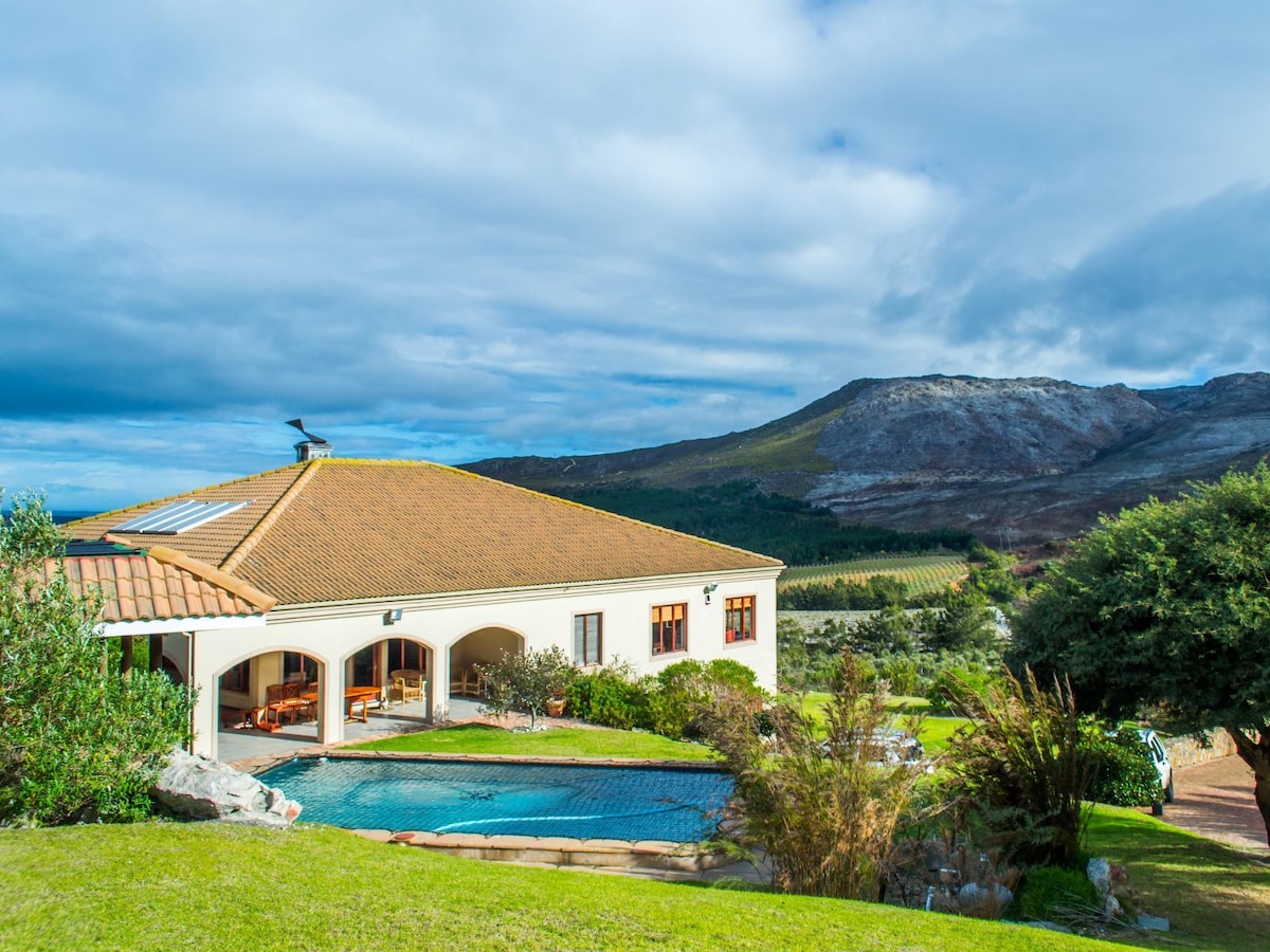 Փախեք դեպի մեր շքեղ վիլլան Benguela Cove Wine Estate - ում: Հանգստացեք ջակուզիում կամ լողավազանում ՝ ցնցող ծովածոցով և լեռնային տեսարաններով ։ Վայելեք մեծ մահճակալներ, գինու համտես, մառանով շրջագայություններ, համադամասերական ռեստորան և արկածային գոլֆ ՝ ընդամենը մի քանի քայլ հեռավորության վրա ։ Հանգստի և արկածների համար կատարյալ հանգիստ ։ Այս սեփականության համար պահանջվում է վերադարձվող երաշխիքային ավանդ ։