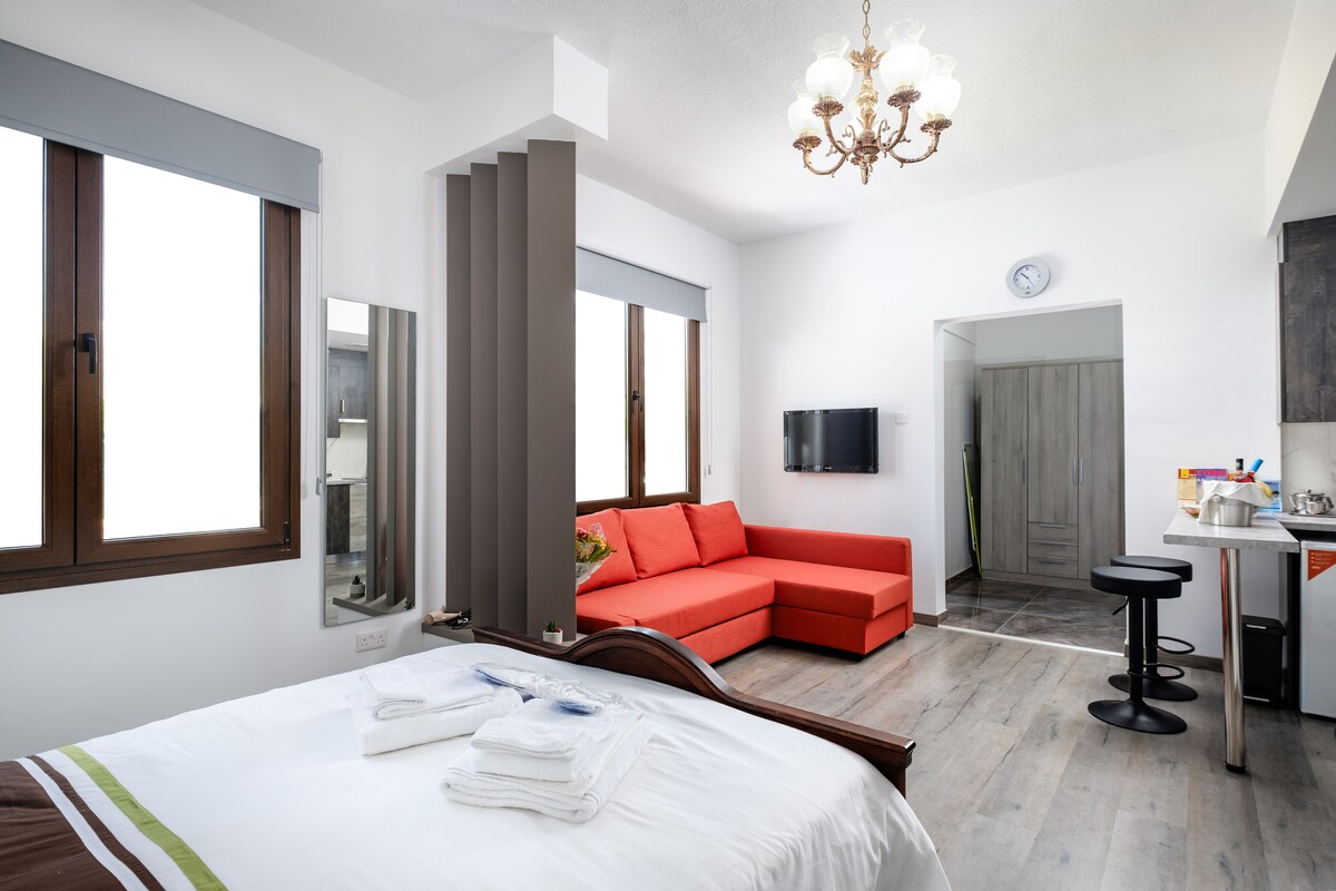 Վերադարձեք և հանգստացեք այս հանգիստ, ոճային տարածքում ։ Մեր արևոտ ստուդիայի օազիսը հիանալիորեն գտնվում է կենտրոնական Լառնակայում գտնվող հանգիստ բնակելի շենքում ։ Հեշտությամբ մուտք գործեք Մետրոպոլիս մոլ և գեղեցիկ Լառնակա Ֆինիկուդես լողափ ՝ մեքենայով ընդամենը 5 րոպե հեռավորության վրա ։ Օդանավակայանը հարմարավետորեն գտնվում է ձեր շեմից 12 րոպե հեռավորության վրա: Մեր բնակարանը իդեալական հիմք է այն ամենն ուսումնասիրելու համար, ինչ առաջարկում է Լառնական ՝ հեշտությամբ մուտք գործելով դեպի Նիկոսիա, Լիմասոլ և Այա Նապա կապող մայրուղիներ ։