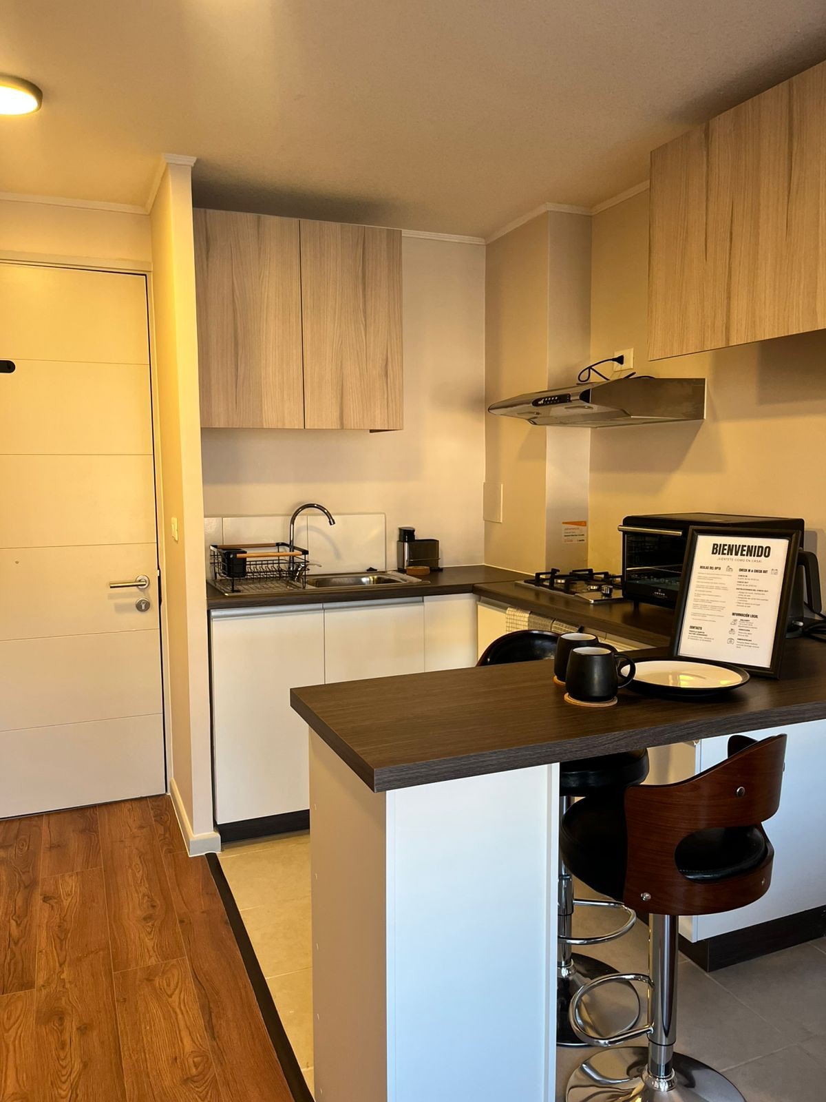 Disfruta de la comodidad y estilo en este departamento full equipado, ubicado estratégicamente con acceso a Av. Picarte y Costanera, a solo minutos del centro de Valdivia. - Living comedor. - Cocina full equipada: horno eléctrico, campana, microondas, lavavajillas, refrigerador, hervidor, tostador, cafetera y licuadora. - Baño con termo eléctrico, plancha, secador de pelo y toallas. - Dormitorio con cama de dos plazas. - Terraza. - Wifi 800mbps - Estacionamiento techado al interior del edificio.