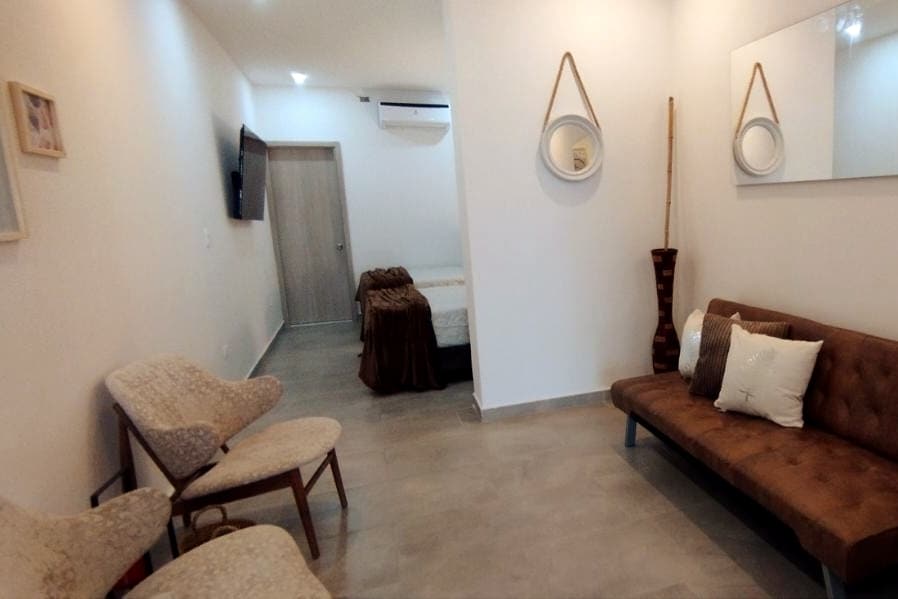 Գեղեցիկ մեկ ննջասենյակով բնակարան, լիովին կահավորված ՝ երկտեղանի մահճակալ և մեկ մահճակալ (երկտեղանի մահճակալ), ինտեգրալ խոհանոց, մառան, լոգասենյակ, Սալա ։ Սենյակում օդորակիչ, 40դյույմանոց հեռուստացույց, արբանյակային հեռուստատեսություն, միկրոալիքային վառարան, լվացքի մեքենա, սառնարան ։ 300 Մբ Wi - Fi ։ Հասանելի է դիմակահանդեսի համար ։ Այն պետք է տևի բոլոր չորս օրերը ։ Ծածկույթով կայանատեղի ։ Գտնվում է Սյուդադ Ժարդինում ՝ Comfamiliar del Norte - ին, Universidad Metropolitana - ին և Parque Sagrado Corazón - ին մոտ ։