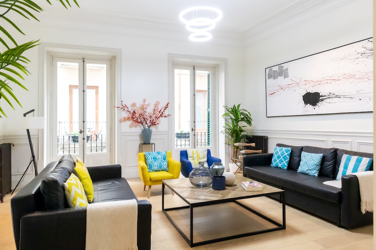 Magnificent 150-meter apartment in the heart of Chueca, next to the Plaza de Chueca, and a few meters from Gran Vía in Madrid. Ideally located so that you can walk to all the emblematic areas of the city: historic center, Malasaña, Barrio Salamanca... It is an apartment with very large spaces and high ceilings that give it a lot of spaciousness. It has 3 bedrooms and 3 bathrooms, two of them en-suite, and is fully equipped. Agreement with a nearby gym.