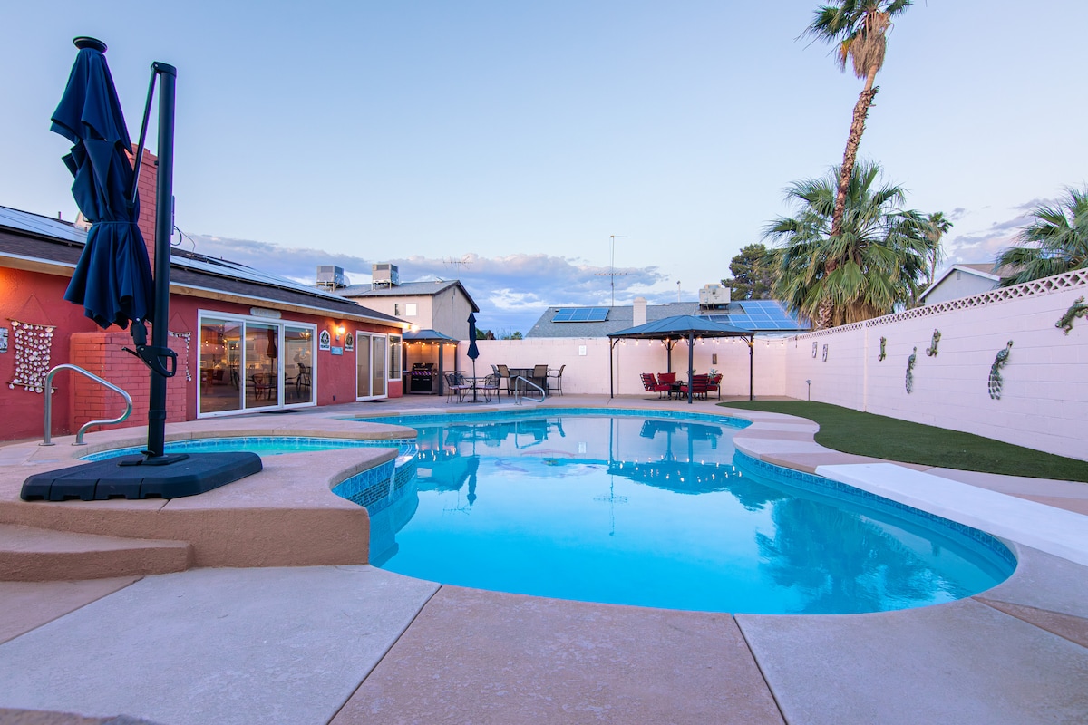 Հետևողական 5⭐ և հյուրերի կողմից սիրված ՝ ինչ - որ պատճառով ։ Այս տան միջոցով դուք ստանում եք 15 մահճակալ, ջեռուցվող լողավազան, ջակուզի, լողավազանի սեղան, խոհարարի խոհանոց, մինի գոլֆ, արկադներ և խաղեր, 10 սմարթ հեռուստացույց, խորոված և այլն: Այս մեծ, բարեկարգ, առողջարանային ոճի տունը կարող է հարմարավետորեն հյուրընկալել ձեր ամբողջ խմբին 1 հարկի տակ ։ Դուք ամրագրման համար կդառնաք ձեր խմբի հերոսը ։ Եվ այն գտնվում է The Strip - ից կամ Fremont Street - ից 10 րոպեից պակաս հեռավորության վրա ։ Կատարյալ է ընտանեկան հավաքույթների, բիզնես ուղևորների կամ հարսանեկան խմբերի համար ։ Ամրագրեք հիմա նախքան ամսաթվերի ընդունումը: