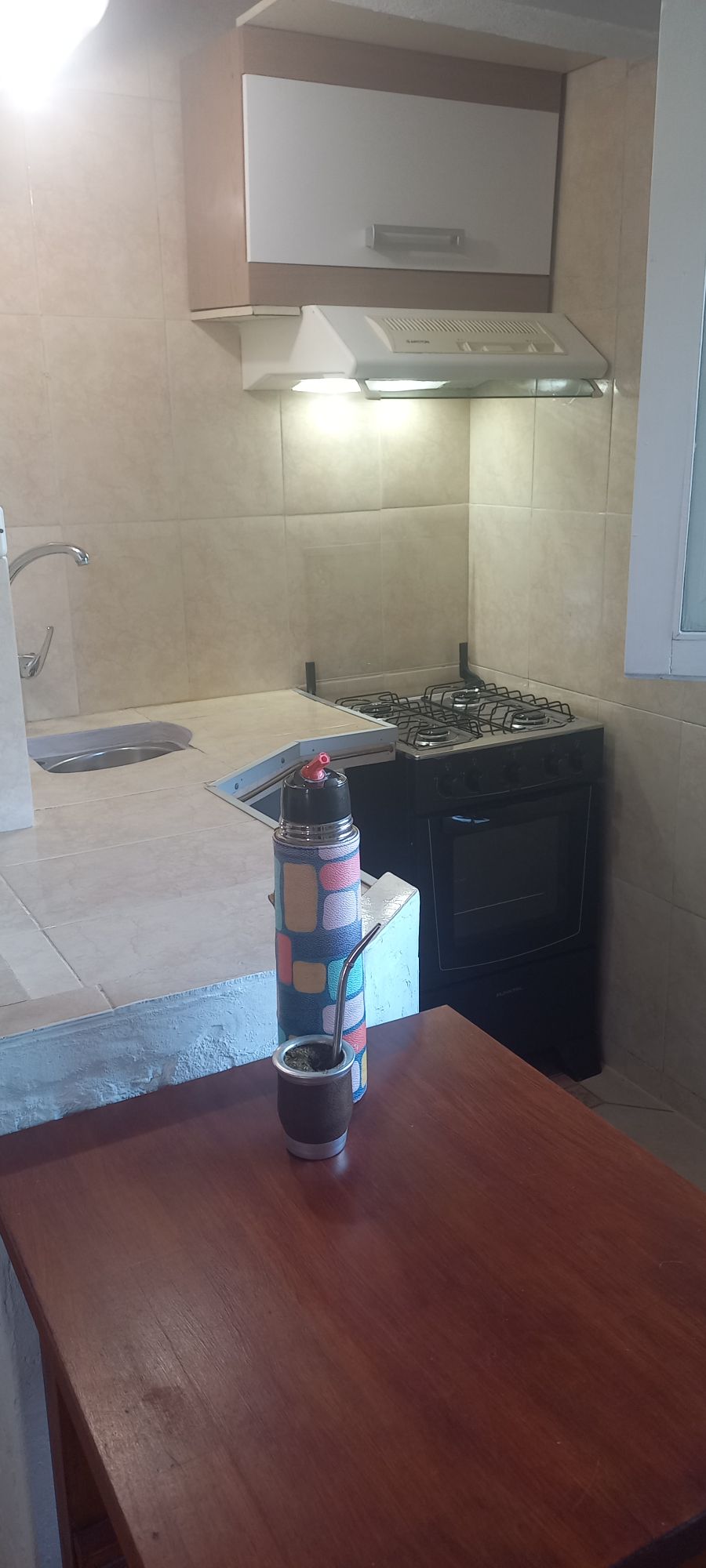 Es un lugar de paso, no sé puede cocinar! es una habitación con baño privado, cuenta con ducha Pero no tiene agua caliente. es como de paso! El patio, parrillero y mesada pertenecen a la otra casa, que si no lo usan y autorizan a usarlo podrán hacerlo, sino no.