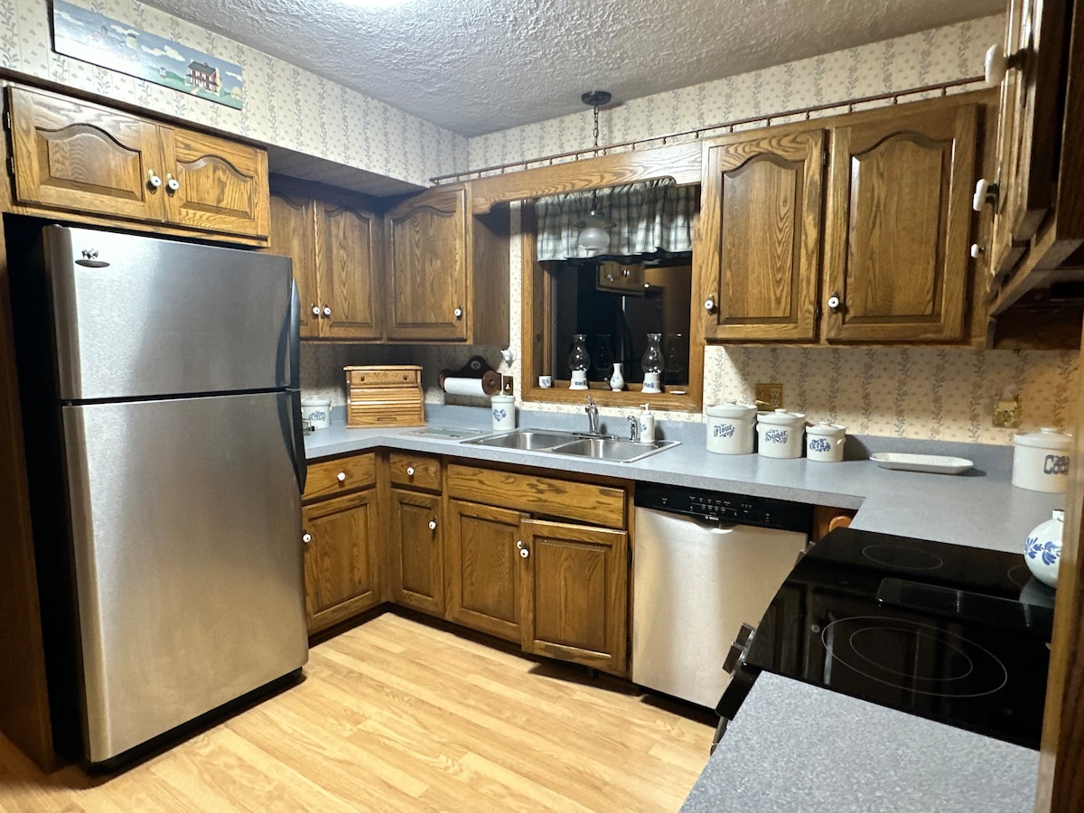 Amish Paradise has an open floor concept with the living room, dining room and kitchen on the first floor. There are 3 bedrooms on the second floor. Going up the stairs we have a side view looking out an arched window into the woods. However, our favorite part of this home is the view from the wrap around deck!! It has a knock out Vista over looking our property and beyond to Marti Park! Did I mention that this house was once a true Amish Home?😉