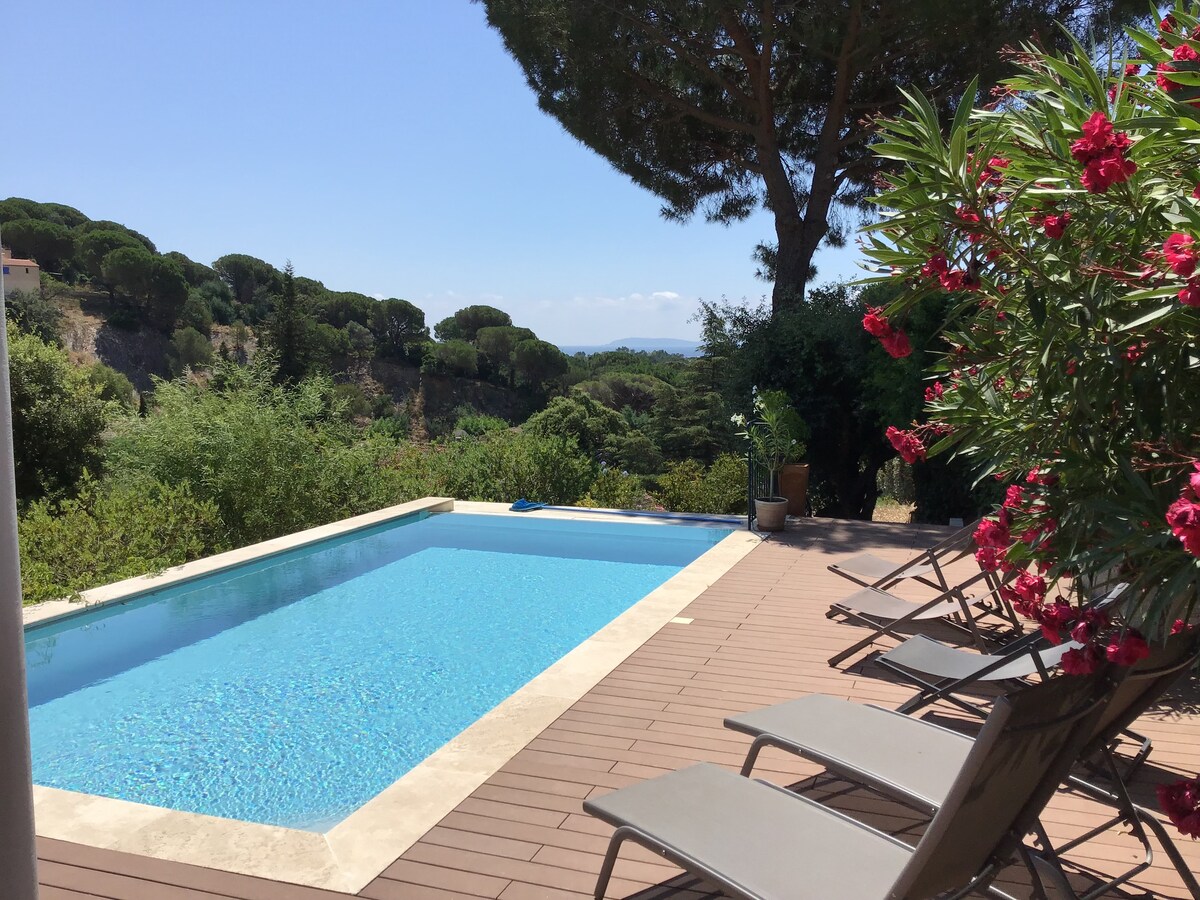 Villa sur 2 étages avec piscine à débordement & terrasse vue sur mer. A 850m de la plage et du centre de Cavalière 1er etage : salon donnant sur cuisine ouverte (+ bureau) - 1 chambre avec 1 lit double et 1 chambre avec 1 lit simple - 1 salle de bain (1 baignoire + 2 lavabos) - 1 WC cuisine totalement équipée RC : 2 chambres avec chacun 1 lit double - un séjour avec un clic clac 2 personnes - 1 SdB (1 douche + 1 lavabo) - 1 WC - 1 grand garage avec une machine à laver Avec Internet Wifi