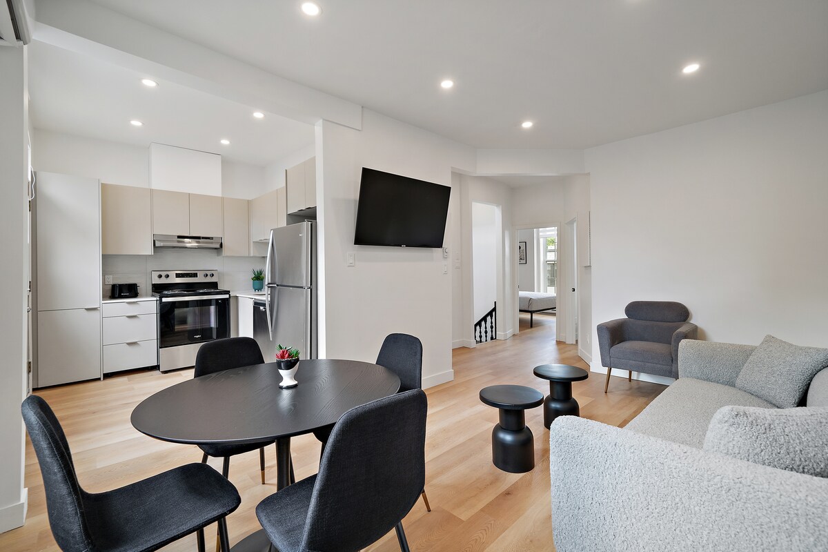 This charming 1,285 square feet townhouse has been completely renovated for maximum comfort! It features 2 bedrooms, 1.5 bathrooms, a fully equipped kitchen, and a laundry room, making it the perfect location for a family vacation! With the metro less than a 5-minute walk away and a private parking spot ($) right behind the accommodation, this townhouse is perfect for a quiet and enjoyable stay in the heart of Montreal.