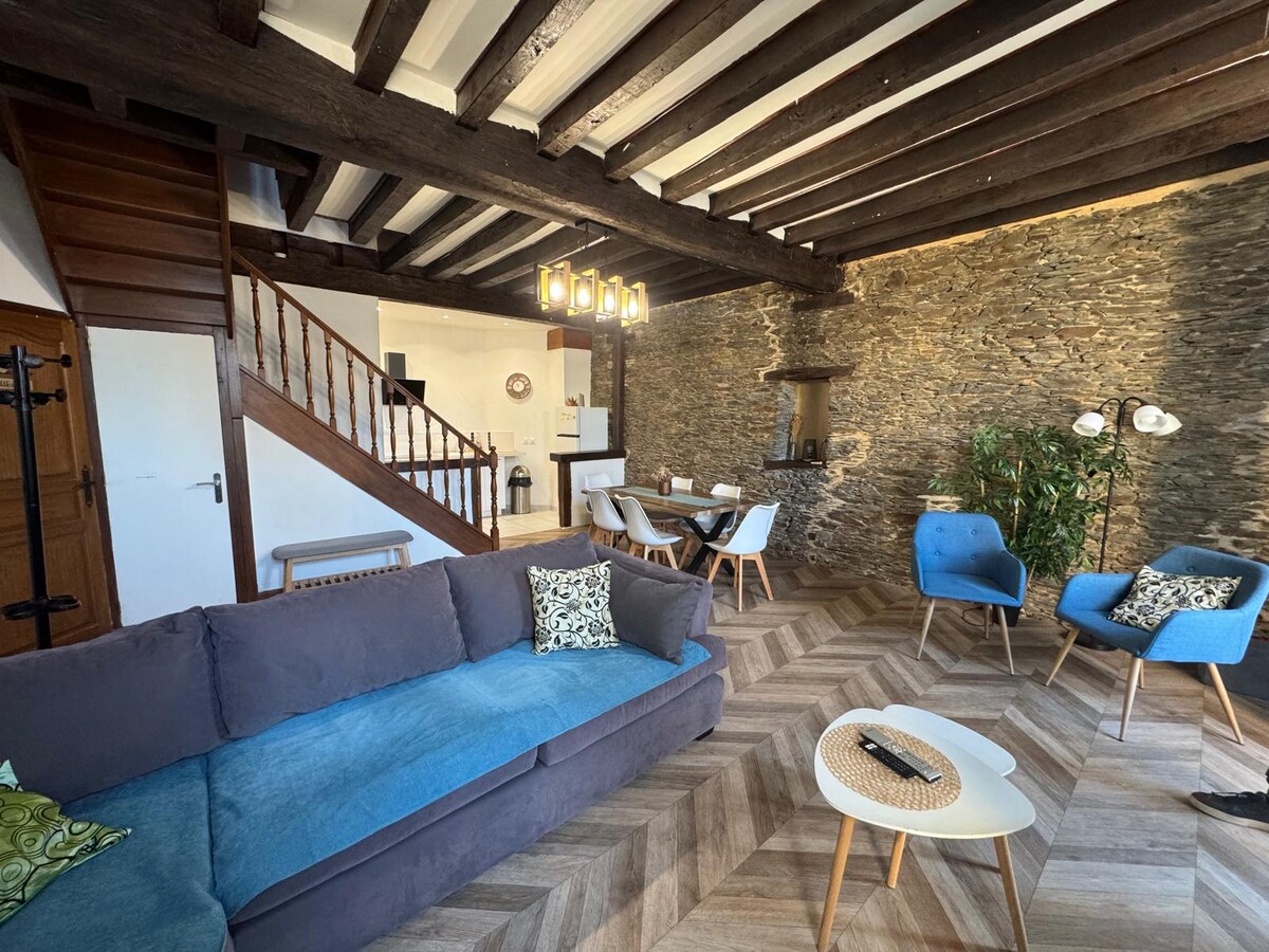 Charmant deux-pièces pour 2 personnes en Anjou Bleu. Séjour lumineux avec cuisine aménagée, chambre modulable (2 lits simples ou 1 lit double) et salle de bains attenante. Profitez d’un cadre calme et d’une superbe vue sur la campagne. Unique par son accueil chaleureux et personnalisé, son environnement verdoyant et son charme authentique, parfait pour se ressourcer et découvrir la douceur de vivre en Anjou. Idéal pour une escapade reposante, proche d’Angers et Nantes.