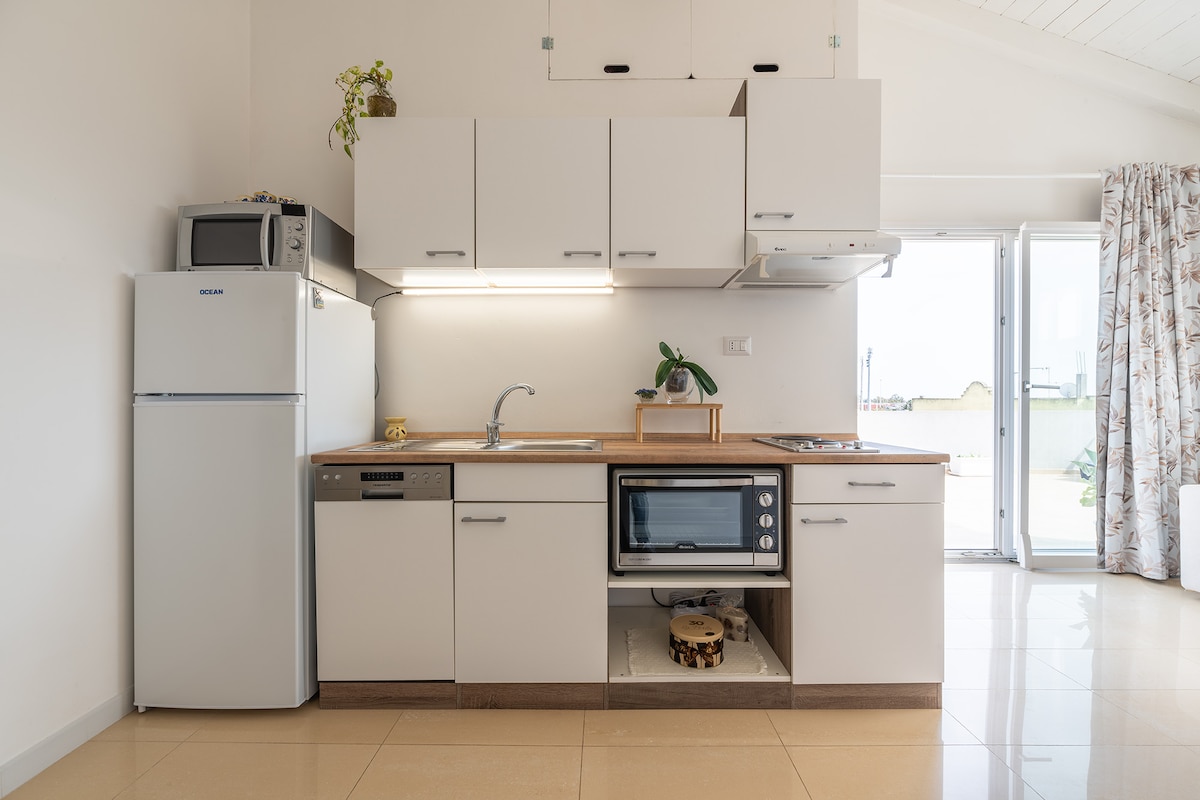 L'appartamento è situato al secondo ed ultimo piano senza ascensore, dotato di ampia terrazza che consentirà di rilassarvi in quest'oasi di quiete ed eleganza. È composto da ingresso con angolo cottura con frigo e freezer, forno, forno a microonde, lavastoviglie, piano cottura elettrico, macchina per il caffè, dotazioni base, tv e divano letto ; camera da letto matrimoniale; bagno. È presente il riscaldamento/condizionamento in entrambe le camere. Ideale per due adulti e un bambino in culla.