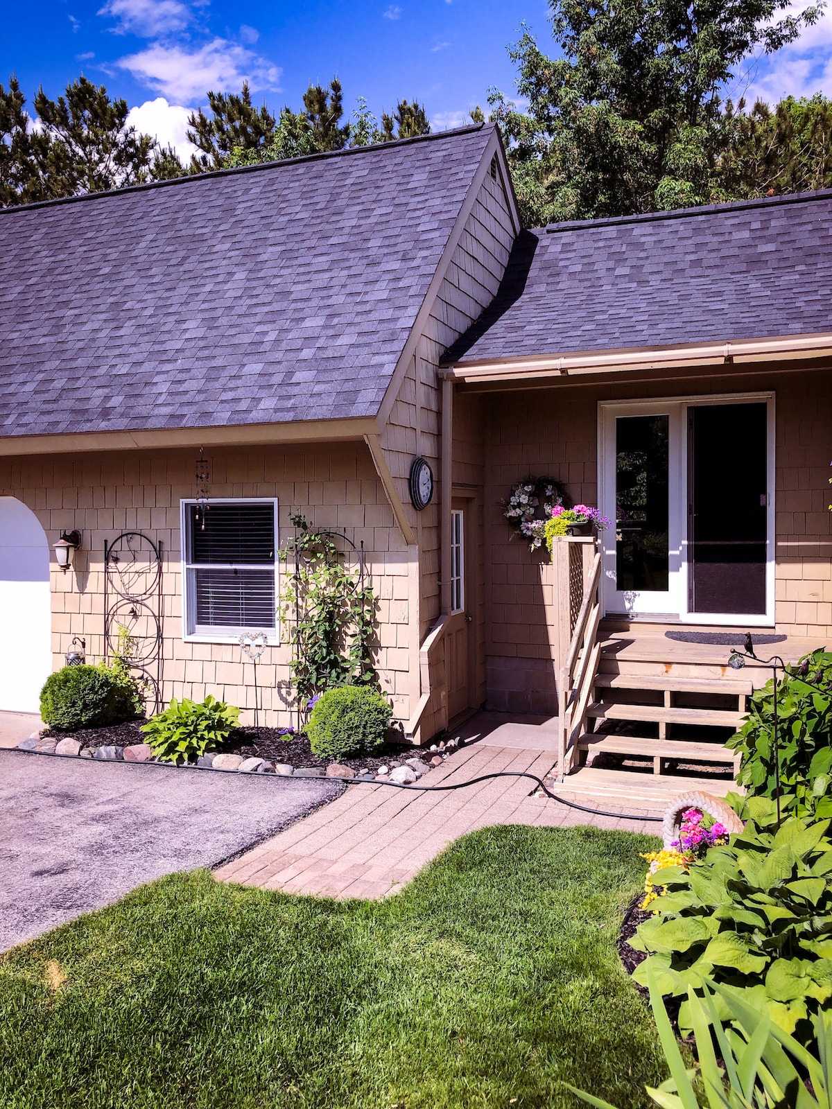 Keep it simple at this peaceful and centrally-located place. Whether you are attending a wedding in the area, are touring the wineries nearby or need a place to relax and explore the beauty of Leelanau County, this guest house is a cozy space to stay! Unplug from the busyness of it all and enjoy the screen-free space with views of the lake from the driveway. Leland, Northport, Suttons Bay and Lake Leelanau are all within a few minutes' drive.