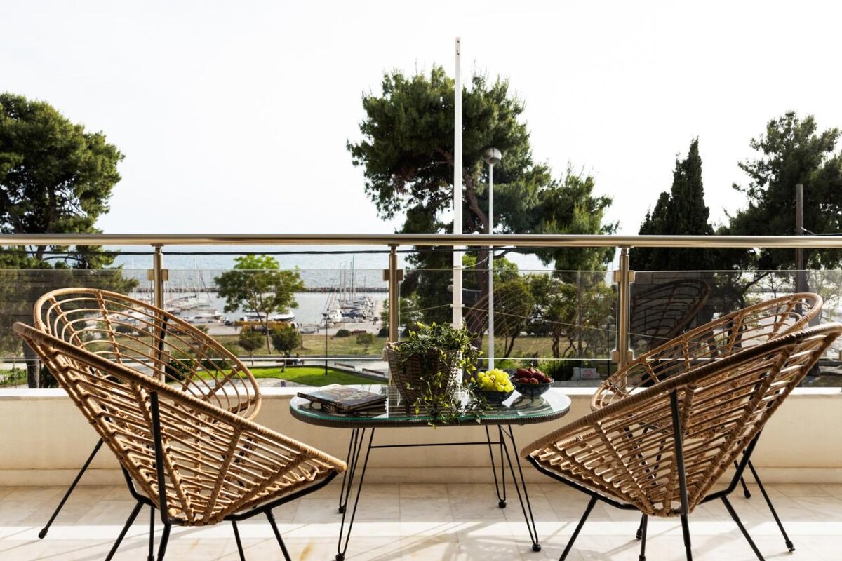 Գեղեցիկ, նրբագեղ, թեթև տանիքով բնակարան ՝ դեպի ծով և լեռ բացվող տեսարաններով ։ Կապույտ աստղանի լողափից և 5 աստղանի հյուրանոցից 3 րոպե հեռավորության վրա ։ Այն ունի բարձրակարգ կահույք, սպասք, արագ Wi-Fi, հեռուստաալիքներ ամբողջ աշխարհից, HIFI համակարգ, օդորակիչ, գազային ջեռուցում, մասնավոր կայանատեղի, երեք պատշգամբ, վերելակ, ներքին հեռախոսակապ և մեծ զգեստապահարան։ Գերովասիլիուին (գինու տուն), օդանավակայանին (15 րոպե), ամռանը նավակով դեպի քաղաքի կենտրոն (45 րոպե )։ Փոքր վճարի դիմաց կարող ենք ձեզ դիմավորել օդանավակայանում։