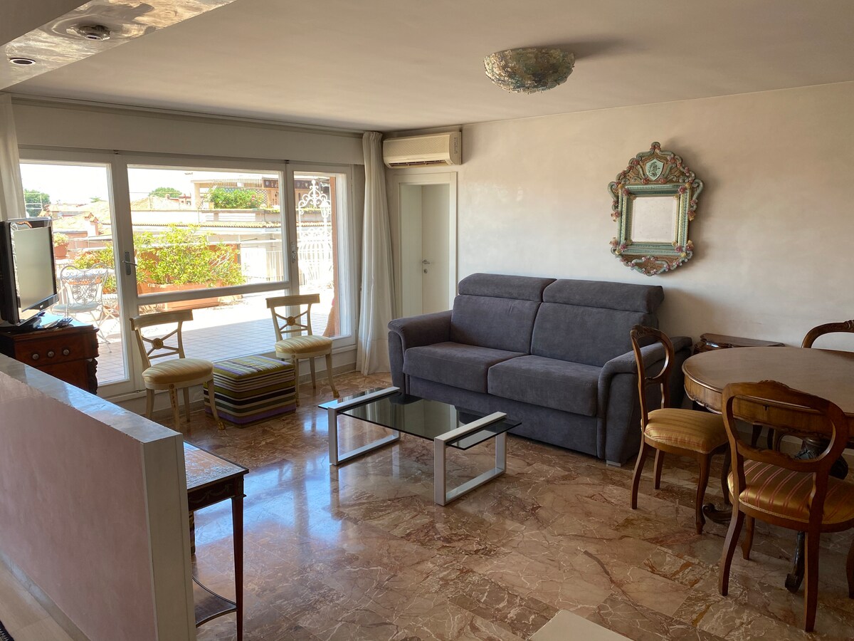 Վայելեք հանգիստը Լիդո դի Վենեցիայում ՝ այս հարմարավետ պենտհաուսում ։ Դուք ձեզ կզգաք ինչպես տանը և կարող եք ձեզ լավ զգալ բնակարանում ՝ յուրահատուկ ոճով, որը այն յուրահատուկ է դարձնում և կվայելեք այն գեղեցիկ տեռասը, որն առաջարկում է ձեզ հանգստի գոտի, որտեղ կարող եք արևայրուք ընդունել և ճաշել զբոսայգուն նայող: Ծովից քար է նետվում, կենտրոնում ՝ բոլոր խանութների և ծառայությունների հարմարավետությունը և գեղեցիկ Վենետիկից մի քանի րոպե հեռավորության վրա: Գեղեցիկ արձակուրդի կամ այցի մասին հիշողություն պարգևելու համար ։