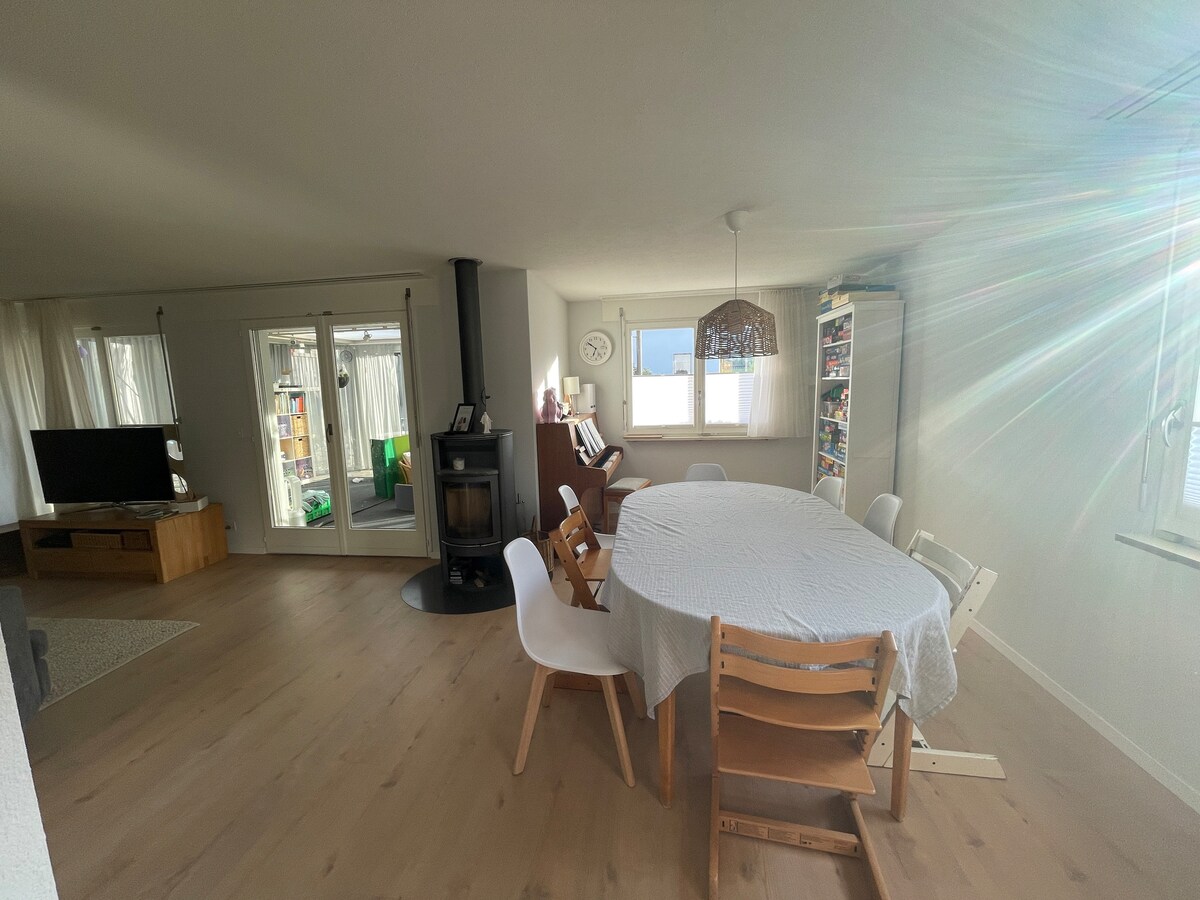 Փոքր լուսավոր, հանգիստ, 2 սենյականոց բնակարան սեփական լվացքի մեքենայով, ամանալվաց մեքենա, ջեռոց, սառնարան և այլն: Առանձին մուտք և այգու պատիո ։ Ավելի երկար օգտագործման համար կայանելը ենթակա է գանձման: Հասարակական տրանսպորտի գնացքով 25 րոպեում Բազելում կամ Օլթենում: Չծխողների բնակարան
