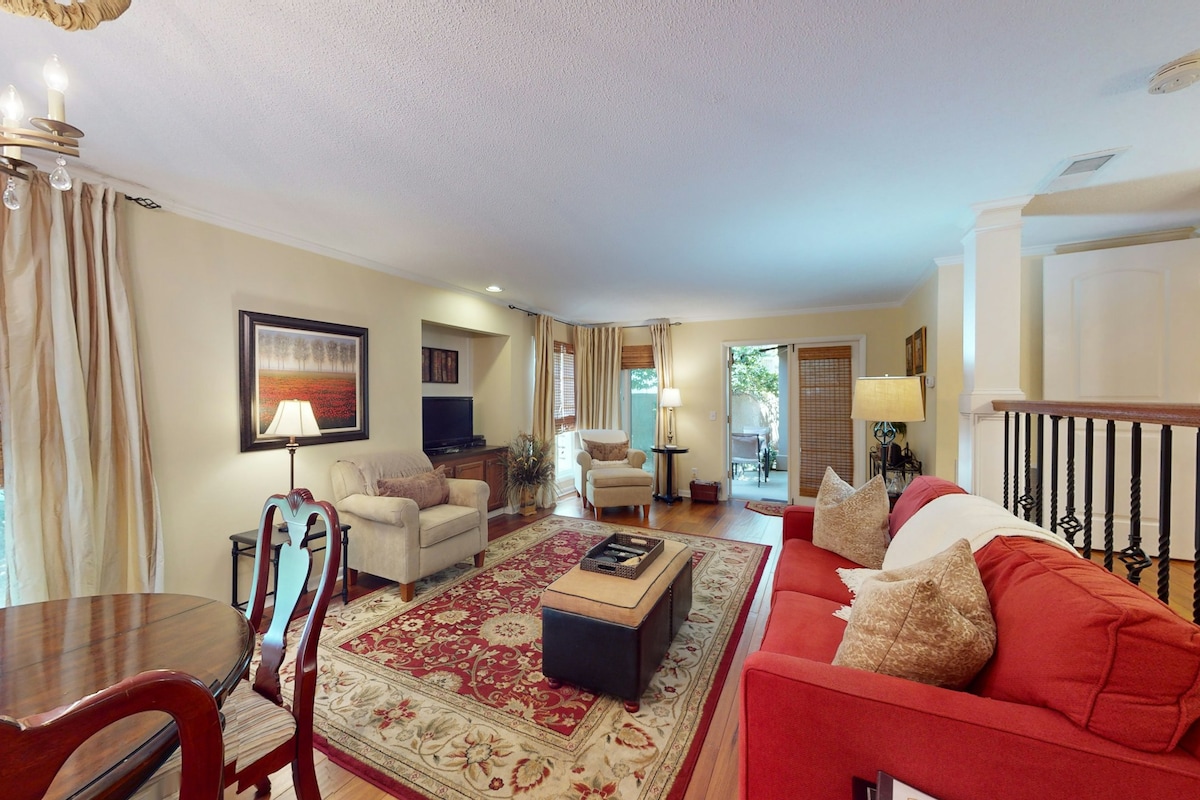 Welcome to your dream vacation rental in Hilton Head Island! Nestled in a prime location, this exquisite condo offers the epitome of coastal luxury and relaxation. As you step inside, you're greeted by a newly updated interior adorned with contemporary furnishings, creating a welcoming and comfortable atmosphere for you and your family. The spacious living area is perfect for unwinding after a day at the beach, featuring plush sofas and a flat-screen TV for your entertainment.