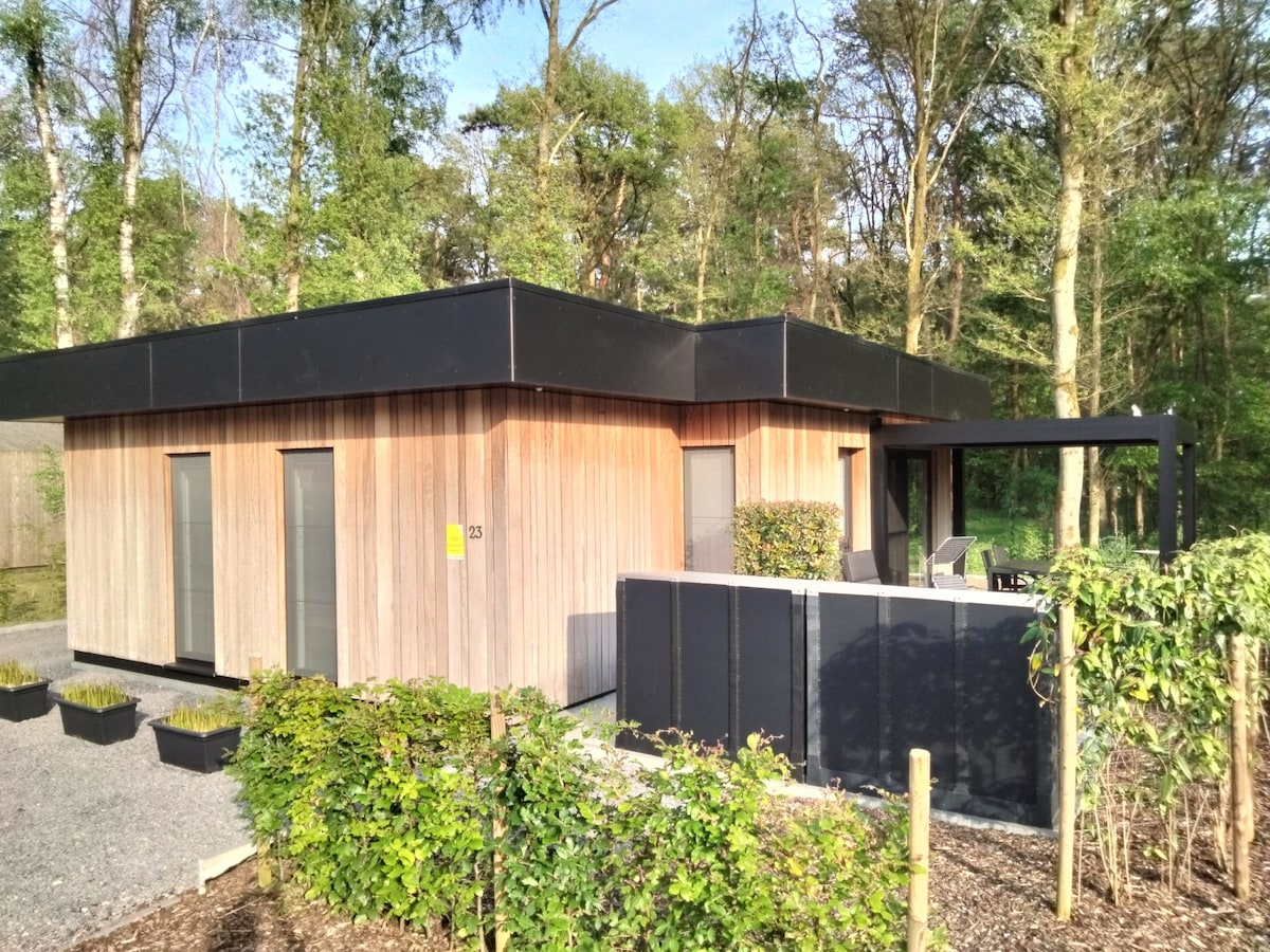 Vintage boshuisje grote buitensauna en grote tuin