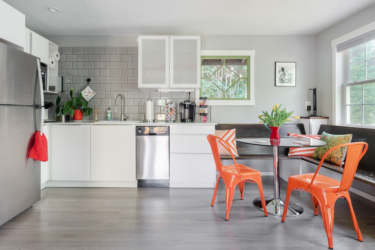 Unwind and relax in this serene and private getaway, with a keyless entrance, private bath, full kitchen, and in-unit laundry, so you can pack light and stay fresh. Enjoy your morning coffee on the cozy deck, surrounded by nature. Walk to a local coffee shop, the library, or beautiful Lincoln Park for a refreshing escape. Come and enjoy a relaxing retreat with everything you need for a comfortable stay! Recommendations of places to eat and visit can be found in the guidebook.