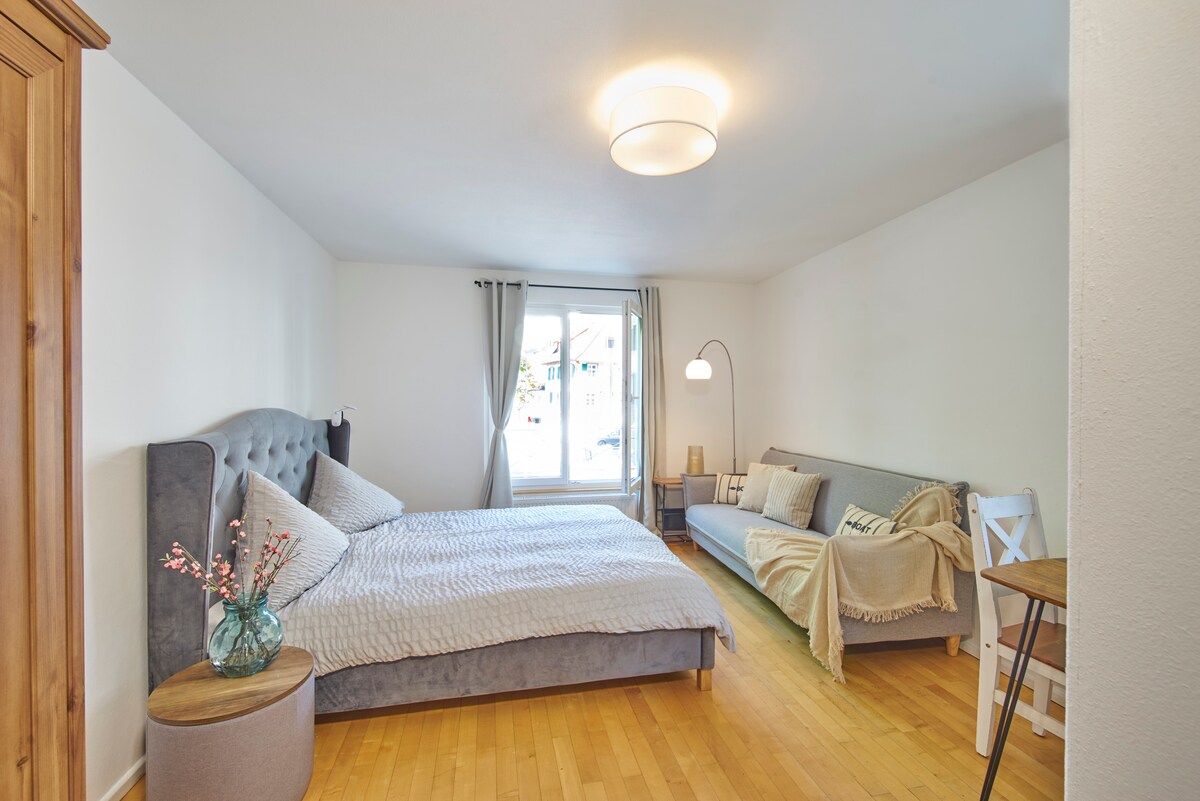 Այս ժամանակակից ստուդիո բնակարանը գտնվում է լճին մոտ (3 րոպե) և առաջարկում է մաքուր և հողեղեն դիզայն: Ամբողջովին կահավորված խոհանոցը, առանձին լոգասենյակը ՝ ցնցուղով, հյուրասենյակը և հարմարավետ հյուրասենյակը/ճաշասենյակը, ինչպես նաև հարմարավետ երկտեղանոց մահճակալը հրավիրում են ձեզ լիովին հանգստանալու և վայելելու: Ermatingen - ը գեղատեսիլ ձկնորսական գյուղ է, որտեղ կան գեղեցիկ զբոսանքի երթուղիներ, մի քանի ռեստորաններ և հեծանվային ճանապարհ անմիջապես տան դիմաց: Մենք առաջարկում ենք ապահով կայանատեղի մեր ավտոտնակում 1 մեքենայի համար:
