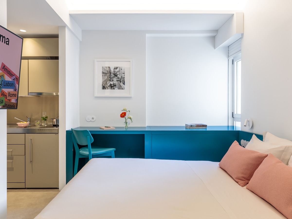 Stylish, spacious, and central studio apartment with: 🛌 Best sleep quality : comfortable king bed, luxury pillows and soft white linen 🚿 Very large marble bathroom with quality towels and free toiletries ❄️ A/C 👗 Washer & dryer 🛗 Elevator 👨🏻🍳 Kitchen 🍷 Vibrant area with many restaurants, shops and cafes 📍 Walking distance to Chiado, Bairro Alto & Cais do Sodré 🚋 Directly on Tram 28 📶 Wi-Fi 📺 Smart TV with 200+ HD Channels 🧼 Squeaky clean 🛒 Supermarket is 1 minute away