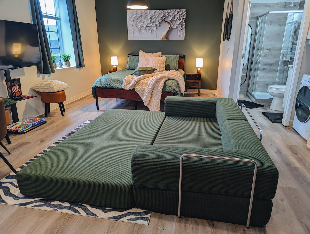 Դուք մնալու եք Քորքթաունի սրտում գտնվող մեր ժամանակակից տան վերին հարկաբաժնում ։ Բլոկն ունի մասնավոր մուտք կողքի մուտքից և 17 դյույմ բարձր կամարակապ առաստաղներ ՝ երեսպատման ժապավենով, որը կտրում է տարածքը ՝ երկնքի մի կտոր բացահայտելու համար ։ Մեր ամբողջական խոհանոցը համալրված է հիմնական պարագաներով ։ Ճաշասեղանը կարող է տեղավորել աշխատանք կամ սնունդ ։ Ննջասենյակից բացվում է շքեղ տեսարան դեպի պատմական Միչիգանի կենտրոնական գնացքի պահեստ ։