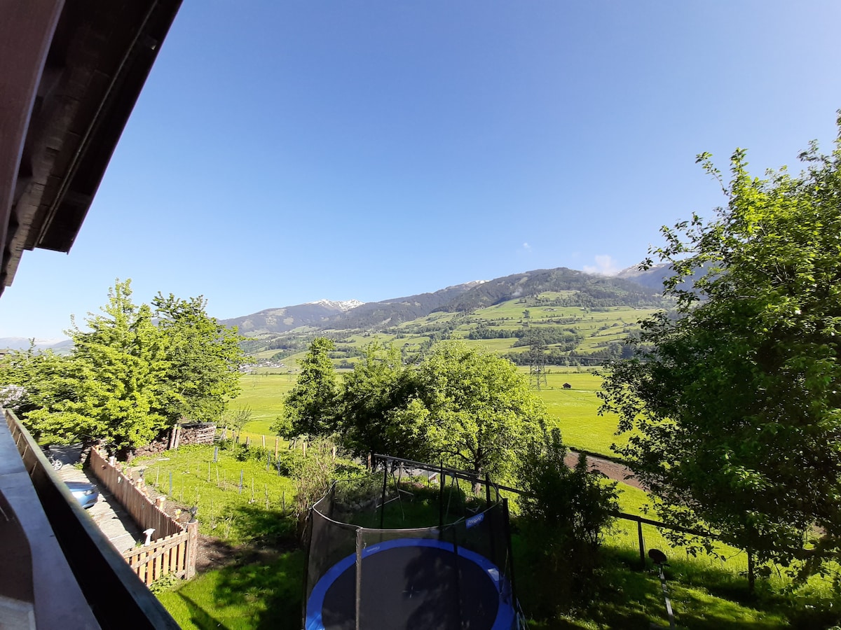 Our family-run organic farm is situated 985 m above sea level with a beautiful view on the alps. We are surrounded by skiing areas: Zell am See-Schmittenhöhe, Kaprun-Kitzsteinhorn, Kitzbühel, Saalbach-Hinterglemm and Leogang. In addition, the Krimml Waterfalls and the Grossglockner High Alpine Road are close. The apartment is situated on the bottom floor of the farmhouse. It has its own entrance and a cosy sheltered patio with a great view that is situated directly next to a big garden.
